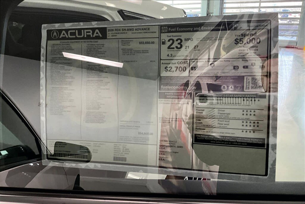 Platinum White Pearl 2026 Acura RDX Advance Package SH-AWD AWD 10-Speed Automatic 2.0L 16V DOHC AWD.