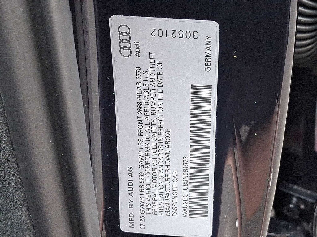 PREMIUM PLUS LED Interior Lighting Pro Package, Heated Steering Wheel w/Hands-On Detection, Top View Camera System, USB Power Delivery (2x60W Front & 2x100W Rear), Adaptive Cruise Assist, Dynamic Interaction Light, Animation for Taillights, Bang & Olufsen Sound System w/3D Sound, Head-Up Display, LED Headlights Plus w/Digital DRL, Park Assist Plus, BLACK WARM WEATHER PACKAGE Manual Rear Side Window Sunshades, Heated & Ventilated Front Sport Seats, 8-way power front seats w/4-way power lumbar and driver memory, 19 WHEEL PACKAGE Wheels: 19 5-Arm-Aero Design Bi-Color Finish, Tires: 245/40R19 98H XL All-Season Runflat, AUDI GUARD PROTECTION KIT Cargo Mat, All-Weather Floor Mats. Remote Trunk Release, Keyless Entry, Steering Wheel Controls, Child Safety Locks, Electronic Stability Control.