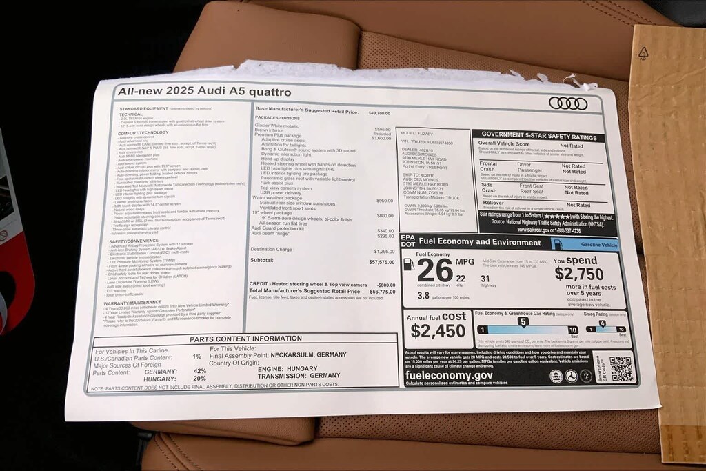 A5 is nicely equipped with quattro, Brown Leather, 10 Speakers, 4-Wheel Disc Brakes, ABS brakes, Air Conditioning, Alloy wheels, AM/FM radio: SiriusXM w/360L, Anti-whiplash front head restraints, Auto High-beam Headlights, Auto-dimming door mirrors, Auto-dimming Rear-View mirror, Automatic temperature control, Brake assist, Bumpers: body-color, Compass, Delay-off headlights, Driver door bin, Driver vanity mirror, Dual front impact airbags, Dual front side impact airbags, Electronic Stability Control, Emergency communication system: Audi connect CARE, Exterior Parking Camera Rear, Four wheel independent suspension, Front anti-roll bar, Front Bucket Seats, Front Center Armrest, Front dual zone A/C, Front fog lights, Front reading lights, Garage door transmitter: HomeLink, Genuine wood dashboard insert, Genuine wood door panel insert, Heated door mirrors, Heated Front Bucket Seats, Heated front seats, Illuminated entry, Knee airbag, Leather Seating Surfaces, Leather steering wheel, Low tire pressure warning, Memory seat, Navigation system: MMI Navigation plus, Occupant sensing airbag, Outside temperature display, Overhead airbag, Overhead console, Panic alarm, Passenger door bin, Passenger vanity mirror, Power adjustable front head restraints, Power door mirrors, Power driver seat, Power Liftgate, Power passenger seat, Power steering, Power windows, Radio data system, Radio: Audi Sound System, Rain sensing wipers, Rear air conditioning, Rear anti-roll bar, Rear reading lights, Rear seat center armrest, Rear window defroster, Remote keyless entry, Security system, Speed control, Speed-sensing steering, Speed-Sensitive Wipers, Split folding rear seat, Steering wheel mounted audio controls, Tachometer, Telescoping steering wheel, Tilt steering wheel, Traction control, Trip computer, Turn signal indicator mirrors, Variably intermittent wipers, and Wheels: 18 5-Arm-Twist Design. Price includes: $3000 - Customer Credit Lock Program. Exp. 03/31/2026