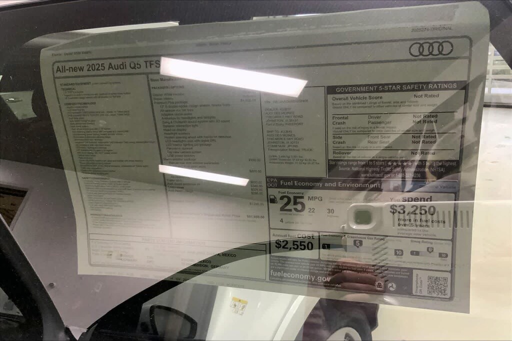 Q5 2.0T Premium Plus is nicely equipped with Brown Leather, 10 Speakers, 4-Wheel Disc Brakes, ABS brakes, Air Conditioning, Alloy wheels, AM/FM radio: SiriusXM w/360L, Auto High-beam Headlights, Auto tilt-away steering wheel, Auto-dimming door mirrors, Auto-dimming Rear-View mirror, Automatic temperature control, Brake assist, Bumpers: body-color, Compass, Delay-off headlights, Driver door bin, Driver vanity mirror, Dual front impact airbags, Dual front side impact airbags, Electronic Stability Control, Emergency communication system: Audi connect CARE, Exterior Parking Camera Rear, Four wheel independent suspension, Front anti-roll bar, Front Bucket Seats, Front Center Armrest, Front dual zone A/C, Front fog lights, Front reading lights, Garage door transmitter: HomeLink, Genuine wood console insert, Genuine wood dashboard insert, Genuine wood door panel insert, Heated door mirrors, Heated Front Bucket Seats, Heated front seats, Illuminated entry, Leather Seating Surfaces, Leather steering wheel, Low tire pressure warning, Memory seat, Navigation system: Audi Navigation Plus, Occupant sensing airbag, Outside temperature display, Overhead airbag, Overhead console, Panic alarm, Passenger door bin, Passenger vanity mirror, Power door mirrors, Power driver seat, Power Liftgate, Power passenger seat, Power steering, Power windows, Radio data system, Radio: MMI Navigation Plus, Rain sensing wipers, Rear air conditioning, Rear anti-roll bar, Rear fog lights, Rear reading lights, Rear seat center armrest, Rear window defroster, Rear window wiper, Remote keyless entry, Roof rack, Security system, Speed control, Speed-sensing steering, Speed-Sensitive Wipers, Split folding rear seat, Spoiler, Steering wheel mounted audio controls, Tachometer, Telescoping steering wheel, Tilt steering wheel, Traction control, Trip computer, Turn signal indicator mirrors, Variably intermittent wipers, and Wheels: 18 5-Arm-Twist Design.