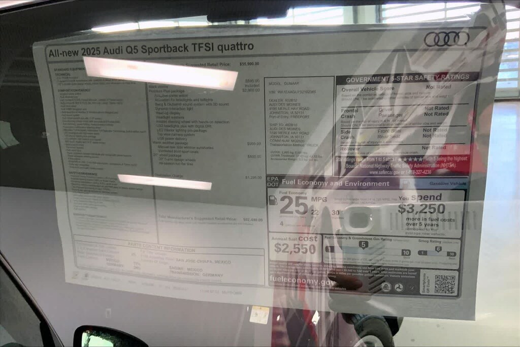 Mythos Black Metallic 2025 Audi All-new Q5 2.0T Premium Plus quattro quattro 7-Speed Automatic S tronic 2.0L 4-Cylinder TFSI ABS brakes, Alloy wheels, Compass, Electronic Stability Control, Front dual zone A/C, Heated door mirrors, Heated Front Bucket Seats, Heated front seats, Illuminated entry, Low tire pressure warning, Navigation System, Power Liftgate, Remote keyless entry, Traction control.
