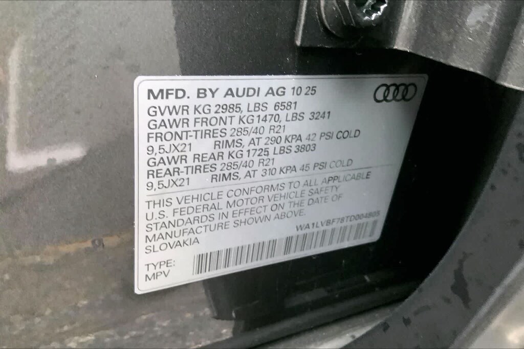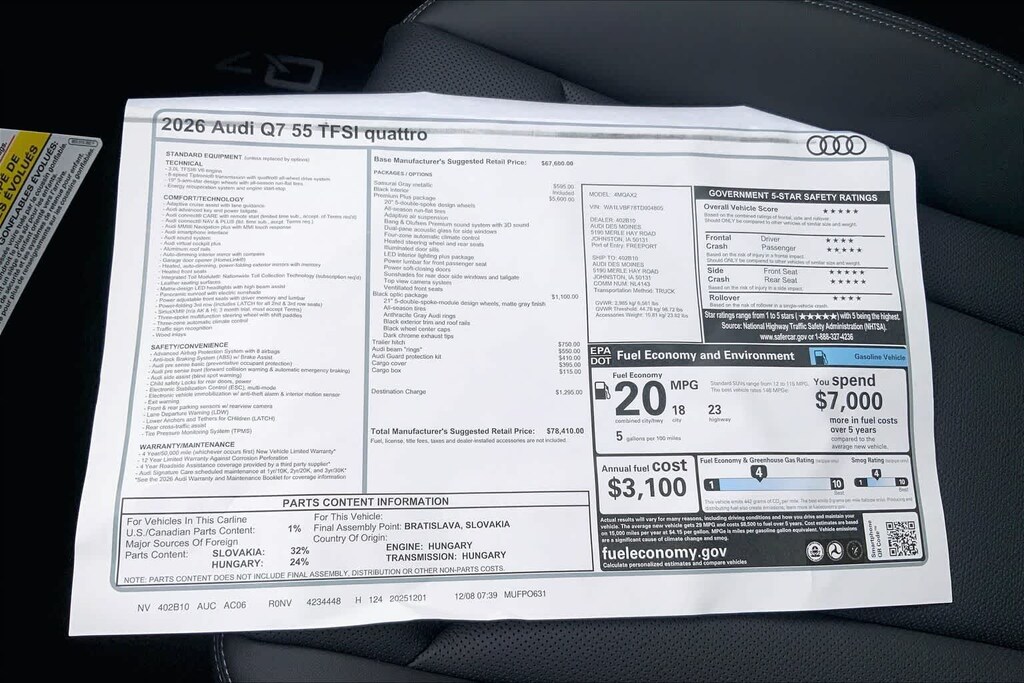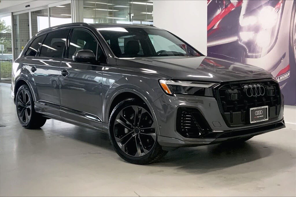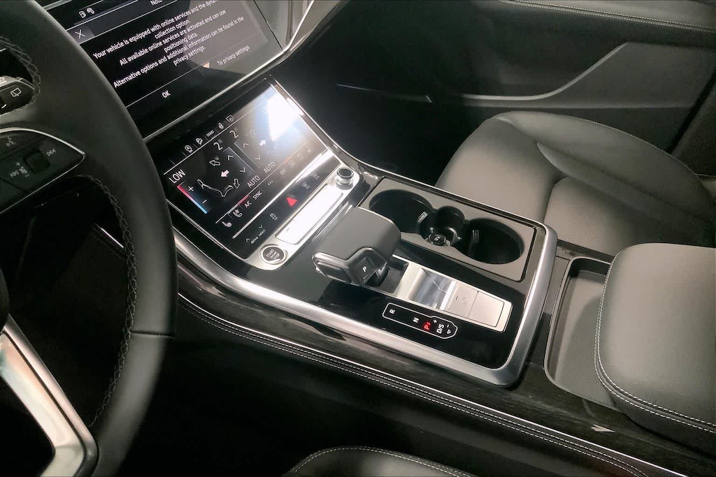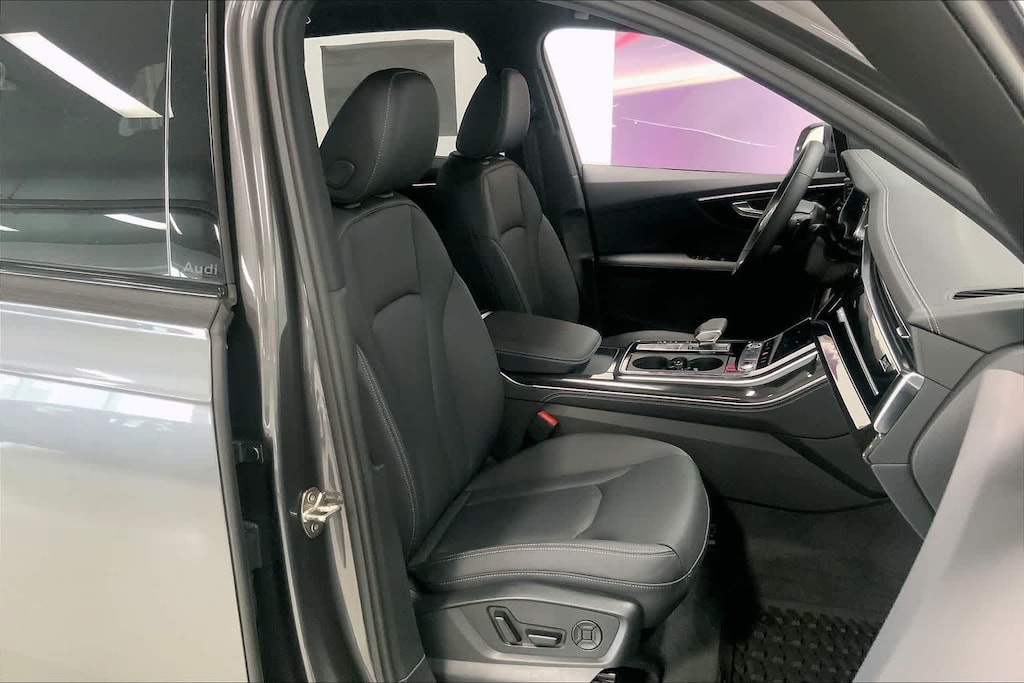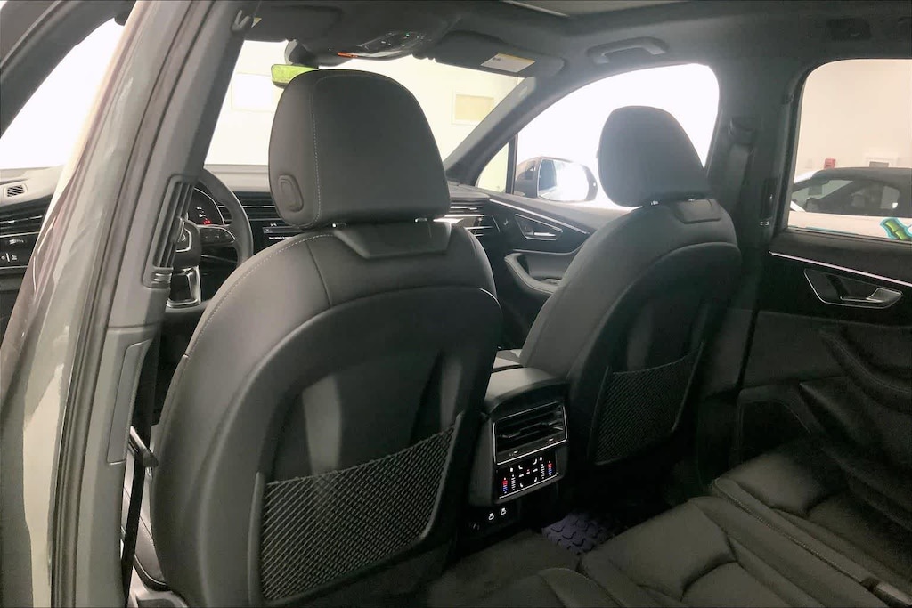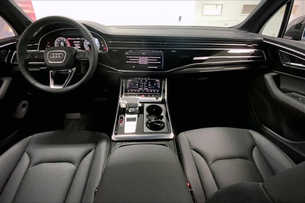 Q7 55 Premium Plus is nicely equipped with 10 Speakers, 3rd row seats: bench, 4-Wheel Disc Brakes, ABS brakes, Air Conditioning, Alloy wheels, AM/FM radio, Auto High-beam Headlights, Auto-dimming door mirrors, Auto-dimming Rear-View mirror, Automatic temperature control, Brake assist, Bumpers: body-color, Compass, Delay-off headlights, Driver door bin, Driver vanity mirror, Dual front impact airbags, Dual front side impact airbags, Electronic Stability Control, Emergency communication system: Audi connect CARE, Exterior Parking Camera Rear, Four wheel independent suspension, Front anti-roll bar, Front Bucket Seats, Front Center Armrest, Front dual zone A/C, Front fog lights, Front reading lights, Fully automatic headlights, Garage door transmitter: HomeLink, Genuine wood door panel insert, Heated door mirrors, Heated Front Bucket Seats, Heated front seats, Illuminated entry, Leather Seating Surfaces, Leather Shift Knob, Leather steering wheel, Low tire pressure warning, Memory seat, Navigation system: Audi MMI Navigation plus with Touch Response, Occupant sensing airbag, Outside temperature display, Overhead airbag, Overhead console, Panic alarm, Passenger door bin, Passenger vanity mirror, Power door mirrors, Power driver seat, Power Liftgate, Power moonroof: Panoramic, Power passenger seat, Power steering, Power windows, Radio data system, Radio: Audi Sound System, Rain sensing wipers, Rear air conditioning, Rear anti-roll bar, Rear fog lights, Rear reading lights, Rear seat center armrest, Rear side impact airbag, Rear window defroster, Rear window wiper, Reclining 3rd row seat, Remote keyless entry, Security system, Speed control, Speed-sensing steering, Split folding rear seat, Spoiler, Steering wheel memory, Steering wheel mounted audio controls, Tachometer, Telescoping steering wheel, Tilt steering wheel, Traction control, Trip computer, Turn signal indicator mirrors, Variably intermittent wipers, and Wheels: 19 5-Arm-Star Design. Price includes: $6000 - National Customer Credit. Exp. 03/02/2026
