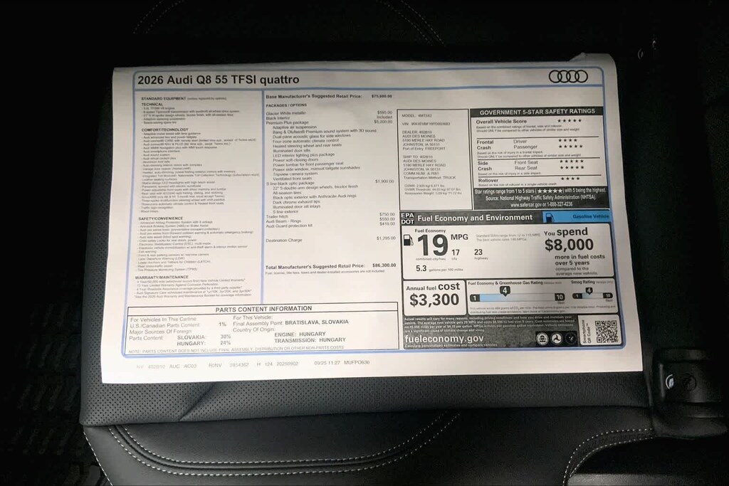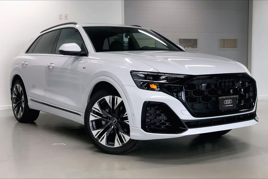 Q8 is nicely equipped with 10 Speakers, 4-Wheel Disc Brakes, ABS brakes, Adaptive suspension, Air Conditioning, Alloy wheels, AM/FM radio, Audi Sound System, Auto High-beam Headlights, Auto-dimming door mirrors, Auto-dimming Rear-View mirror, Automatic temperature control, Brake assist, Bumpers: body-color, Compass, Delay-off headlights, Driver door bin, Driver vanity mirror, Dual front impact airbags, Dual front side impact airbags, Electronic Stability Control, Emergency communication system: Audi connect CARE, Exterior Parking Camera Rear, Four wheel independent suspension, Front anti-roll bar, Front Bucket Seats, Front Center Armrest, Front dual zone A/C, Front fog lights, Front reading lights, Fully automatic headlights, Garage door transmitter: HomeLink, Genuine wood door panel insert, Heated door mirrors, Heated Front Bucket Seats, Heated front seats, Illuminated entry, Leather Seating Surfaces, Leather Shift Knob, Leather steering wheel, Low tire pressure warning, Memory seat, Navigation system: Audi MMI Navigation plus with Touch Response, Occupant sensing airbag, Outside temperature display, Overhead airbag, Overhead console, Panic alarm, Passenger door bin, Passenger vanity mirror, Power door mirrors, Power driver seat, Power Liftgate, Power moonroof: Panoramic, Power passenger seat, Power steering, Power windows, Radio data system, Radio: Audi MMI Navigation Plus with MMI Touch Response, Rain sensing wipers, Rear air conditioning, Rear anti-roll bar, Rear fog lights, Rear reading lights, Rear seat center armrest, Rear side impact airbag, Rear window defroster, Rear window wiper, Remote keyless entry, Security system, Speed control, Speed-sensing steering, Split folding rear seat, Spoiler, Steering wheel memory, Steering wheel mounted audio controls, Tachometer, Telescoping steering wheel, Tilt steering wheel, Traction control, Trip computer, Turn signal indicator mirrors, Variably intermittent wipers, and Wheels: 21 5-W-Spoke Design with Bicolor Finish. Price includes: $4000 - National Customer Credit. Exp. 02/02/2026