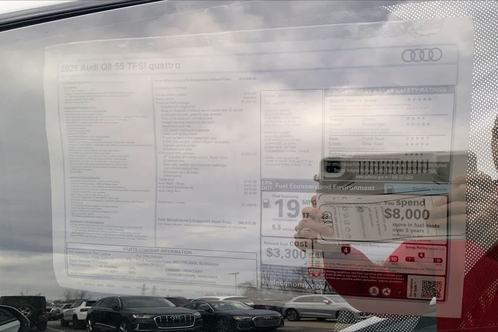 Q8 is nicely equipped with 10 Speakers, 4-Wheel Disc Brakes, ABS brakes, Adaptive suspension, Air Conditioning, Alloy wheels, AM/FM radio, Audi Sound System, Auto High-beam Headlights, Auto-dimming door mirrors, Auto-dimming Rear-View mirror, Automatic temperature control, Brake assist, Bumpers: body-color, Compass, Delay-off headlights, Driver door bin, Driver vanity mirror, Dual front impact airbags, Dual front side impact airbags, Electronic Stability Control, Emergency communication system: Audi connect CARE, Exterior Parking Camera Rear, Four wheel independent suspension, Front anti-roll bar, Front Bucket Seats, Front Center Armrest, Front dual zone A/C, Front fog lights, Front reading lights, Fully automatic headlights, Garage door transmitter: HomeLink, Genuine wood door panel insert, Heated door mirrors, Heated Front Bucket Seats, Heated front seats, Illuminated entry, Leather Seating Surfaces, Leather Shift Knob, Leather steering wheel, Low tire pressure warning, Memory seat, Navigation system: Audi MMI Navigation plus with Touch Response, Occupant sensing airbag, Outside temperature display, Overhead airbag, Overhead console, Panic alarm, Passenger door bin, Passenger vanity mirror, Power door mirrors, Power driver seat, Power Liftgate, Power moonroof: Panoramic, Power passenger seat, Power steering, Power windows, Radio data system, Radio: Audi MMI Navigation Plus with MMI Touch Response, Rain sensing wipers, Rear air conditioning, Rear anti-roll bar, Rear fog lights, Rear reading lights, Rear seat center armrest, Rear side impact airbag, Rear window defroster, Rear window wiper, Remote keyless entry, Security system, Speed control, Speed-sensing steering, Split folding rear seat, Spoiler, Steering wheel memory, Steering wheel mounted audio controls, Tachometer, Telescoping steering wheel, Tilt steering wheel, Traction control, Trip computer, Turn signal indicator mirrors, Variably intermittent wipers, and Wheels: 21 5-W-Spoke Design with Bicolor Finish. Price includes: $4000 - National Customer Credit. Exp. 02/02/2026