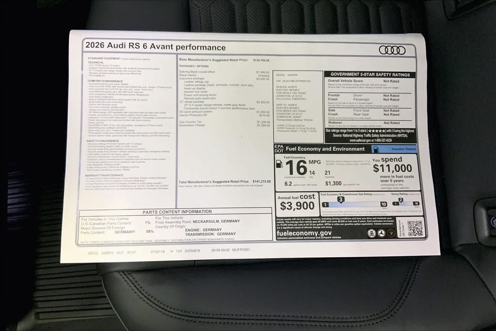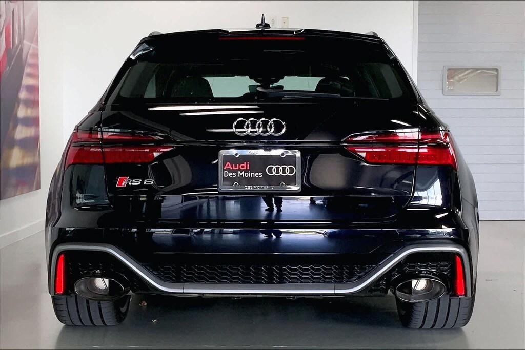 RS 6 Avant performance 4.0T is nicely equipped with 16 Speakers, 4-Wheel Disc Brakes, ABS brakes, Adaptive suspension, Air Conditioning, Alloy wheels, AM/FM radio: SiriusXM w/360L, Auto High-beam Headlights, Auto tilt-away steering wheel, Auto-dimming door mirrors, Auto-dimming Rear-View mirror, Auto-leveling suspension, Automatic temperature control, Bang & Olufsen Premium Sound System with 3D Sound, Brake assist, Bumpers: body-color, Compass, Delay-off headlights, Driver door bin, Driver vanity mirror, Dual front impact airbags, Dual front side impact airbags, Electronic Stability Control, Emergency communication system: Audi connect CARE (limited time subscription - acceptance of terms required), Exterior Parking Camera Rear, Four wheel independent suspension, Front anti-roll bar, Front Bucket Seats, Front Center Armrest, Front dual zone A/C, Front fog lights, Front reading lights, Garage door transmitter: HomeLink, Headlight cleaning, Heated and Ventilated Front Sport Seats Plus, Heated door mirrors, Heated front seats, Heated steering wheel, Illuminated entry, Knee airbag, Leather Shift Knob, Leather steering wheel, Low tire pressure warning, Memory seat, Navigation system: Audi MMI Navigation plus with Touch Response, Occupant sensing airbag, Outside temperature display, Overhead airbag, Overhead console, Panic alarm, Passenger door bin, Passenger vanity mirror, Power door mirrors, Power driver seat, Power Liftgate, Power moonroof, Power passenger seat, Power steering, Power windows, Radio data system, Radio: Audi MMI Navigation Plus with MMI Touch Response, Rain sensing wipers, Rear air conditioning, Rear anti-roll bar, Rear dual zone A/C, Rear reading lights, Rear seat center armrest, Rear side impact airbag, Rear window defroster, Rear window wiper, Remote keyless entry, Security system, Speed control, Speed-sensing steering, Speed-Sensitive Wipers, Split folding rear seat, Spoiler, Sport steering wheel, Steering wheel memory, Steering wheel mounted audio controls, Tachometer, Telescoping steering wheel, Tilt steering wheel, Traction control, Trip computer, Turn signal indicator mirrors, Valcona Leather Seat Trim, Variably intermittent wipers, Ventilated front seats, and Wheels: 21 10-Spoke Star Design.