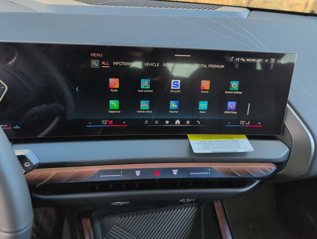 Convenience Package (Heated Steering Wheel, Panoramic Moonroof, Remote Engine Start, and Travel and Comfort System), 12 Speakers, 4-Wheel Disc Brakes, ABS brakes, Air Conditioning, Alloy wheels, AM/FM Radio, AM/FM radio: SiriusXM, Apple CarPlay and Android Auto Compatibility, Auto High-beam Headlights, Auto-dimming door mirrors, Auto-dimming Rear-View mirror, Automatic temperature control, BMW Assist ECall, BMW TeleServices, Brake assist, Bumpers: body-color, Delay-off headlights, Driver door bin, Driver vanity mirror, Dual front impact airbags, Dual front side impact airbags, Electronic Stability Control, Emergency communication system: BMW Assist eCall, Exterior Parking Camera Rear, Four wheel independent suspension, Front anti-roll bar, Front Bucket Seats, Front Center Armrest, Front reading lights, Fully automatic headlights, Garage door transmitter, Genuine wood console insert, Heated door mirrors, Heated Front Seats, Heated front seats, Hi-Fi Sound System, Illuminated entry, Knee airbag, Low tire pressure warning, Lumbar Support, Memory seat, Navigation, Navigation system: BMW Maps Navigation, Occupant sensing airbag, Outside temperature display, Overhead airbag, Overhead console, Panic alarm, Passenger door bin, Passenger vanity mirror, Personal ESIM 5G, Power door mirrors, Power driver seat, Power Front Seats, Power Liftgate, Power moonroof: Panoramic, Power passenger seat, Power steering, Power windows, Radio data system, Rain sensing wipers, Rear anti-roll bar, Rear reading lights, Rear seat center armrest, Rear window defroster, Rear window wiper, Remote keyless entry, Security system, SiriusXM with 360L and 1 Year Trial Subscription, Speed control, Speed-Sensitive Wipers, Split folding rear seat, Spoiler, Sport Seats, Sport steering wheel, Steering wheel mounted audio controls, Tachometer, Telescoping steering wheel, Tilt steering wheel, Traction control, Trip computer, Turn signal indicator mirrors, Variably intermittent wipers, Veganza Perforated and Quilted Upholstery, Wheels: 19 x 8.5 Aero Midnight Grey Bicolor, and Wireless Device Charging.