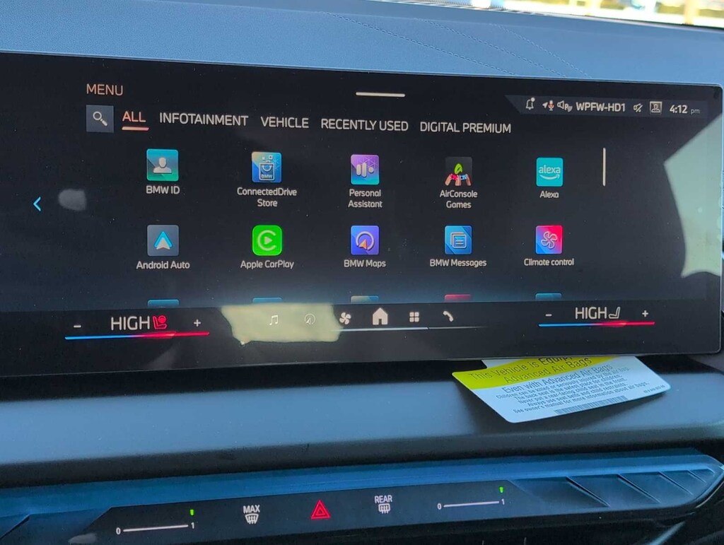 Driving Assistance Professional Package (Distance Control (ACC) with Steering Assistant, Driving Assistant Professional, Lane Change Assistant, and Traffic Jam Assistant), M Sport Package, Premium Package (BMW Curved Display with HUD, Driving Assistance Plus, Heated Steering Wheel, Interior Camera, Panoramic Moonroof, Parking Assistant Plus, Parking View with 3D View (Surround View), Premium Content 1, Remote Engine Start, and Travel and Comfort System), 12 Speakers, 4-Wheel Disc Brakes, ABS brakes, Air Conditioning, Alloy wheels, AM/FM Radio, AM/FM radio: SiriusXM, Apple CarPlay and Android Auto Compatibility, Auto High-beam Headlights, Auto-dimming door mirrors, Auto-dimming Rear-View mirror, Automatic temperature control, BMW Assist ECall, BMW Iconic Glow Kidney Grille, BMW TeleServices, Brake assist, Bumpers: body-color, Delay-off headlights, Driver door bin, Driver vanity mirror, Dual front impact airbags, Dual front side impact airbags, Electronic Stability Control, Emergency communication system: BMW Assist eCall, Exterior Parking Camera Rear, Four wheel independent suspension, Front anti-roll bar, Front Bucket Seats, Front Center Armrest, Front reading lights, Front Ventilated Seats, Fully automatic headlights, Garage door transmitter, Genuine wood console insert, Harman/Kardon Surround Sound System, Heated door mirrors, Heated Front Seats, Heated front seats, Hi-Fi Sound System, Illuminated entry, Knee airbag, Low tire pressure warning, Lumbar Support, M Sport Content, M Sport Exterior Elements, M Sport Interior Elements, M Sport Suspension, M Steering Wheel, Memory seat, Navigation, Navigation system: BMW Maps Navigation, Occupant sensing airbag, Outside temperature display, Overhead airbag, Overhead console, Panic alarm, Passenger door bin, Passenger vanity mirror, Personal ESIM 5G, Power door mirrors, Power driver seat, Power Front Seats, Power Liftgate, Power moonroof: Panoramic, Power passenger seat, Power steering, Power windows, Radio data system, Rain sensing wipers, Rear anti-roll bar, Rear Climate Control Console, Rear reading lights, Rear seat center armrest, Rear window defroster, Rear window wiper, Remote keyless entry, Security system, Shadowline Exterior Trim, SiriusXM with 360L and 1 Year Trial Subscription, Speed control, Speed-Sensitive Wipers, Split folding rear seat, Spoiler, Sport Seats, Sport steering wheel, Steering wheel mounted audio controls, Tachometer, Telescoping steering wheel, Tilt steering wheel, Traction control, Trip computer, Turn signal indicator mirrors, Variable Sport Steering, Variably intermittent wipers, Veganza Perforated and Quilted Upholstery, Wheels: 19 x 8.5 Aero Midnight Grey Bicolor, Wheels: 19 x 8.5 M Midnight Grey Bicolor, Wheels: 20 x 9 Front and 20 x 10.5 Rear M Jet Black, and Wireless Device Charging.