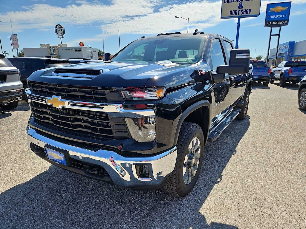 ENGINE, DURAMAX 6.6L TURBO-DIESEL V8 B20-Diesel compatible, (470 hp [350.5 kW] @ 2800 rpm, 975 lb-ft of torque [1322 Nm] @ 1600 rpm), SAFETY PACKAGE includes (UD5) Front and Rear Park Assist, (UKV) Trailer Side Blind Zone Alert, (UFG) Rear Cross Traffic Alert, (UV2) HD Surround Vision, (UVN) Bed View Camera and (TRG) Trailer Camera Provisions (Includes (UET) Trailering App. WHEELS, 20 (50.8 CM) MACHINED ALUMINUM with Grazen Metallic painted accents, 10-spoke, CONVENIENCE PACKAGE includes (UF2) Cargo bed LED lighting, (CJ2) dual-zone automatic climate control, (A2X) 10-way power driver seat including power lumbar, (N37) manual tilt/telescoping steering column, (T3U) LED fog lamps, 3 YEARS ONSTAR ONE, SEATS, FRONT BUCKET with center console, for Crew Cab and Double Cab models, CONVENIENCE PACKAGE II includes (PZ8) Hitch Guidance with Hitch View, (UET) Trailering App, (A48) rear sliding power window and (UG1) Universal Home Remote. Includes (R7O) Cloth Rear Seat with Storage Package. REMOTE START PACKAGE includes (BTV) Remote Start, (UTJ) Theft Deterrent System and (C49) rear-window defogger, Z71 OFF-ROAD PACKAGE includes (Z71) Off-Road suspension with off-road tuned twin tube Rancho shocks, (JHD) Hill Descent Control and (NZZ) skid plates (transfer case and oil pan) (Includes (QXT) LT265/70R17 all-terrain, blackwall tires and molded in color Black grille. MIRRORS, OUTSIDE POWER-ADJUSTABLE VERTICAL TRAILERING WITH HEATED AND AUTO-DIMMING UPPER GLASS lower convex mirrors, turn signal indicators, puddle lamps, (U12) perimeter lighting, auxiliary lighting, power folding/manual extending (extends 3.31 [84.25mm]) Includes (DD8) auto-dimming rearview mirror which can be upgraded to (DRZ) Rear Camera Mirror.), HEAT PACKAGE includes (KA1) Heated driver and passenger seats and (KI3) Heated steering wheel, AUDIO SYSTEM, CHEVROLET INFOTAINMENT 3 PREMIUM SYSTEM with Google built-in compatibility (select service plan required, terms and limitations apply) including navigation capability, 13.4 diagonal HD color touchscreen, includes multi-touch display, AM/FM stereo, Bluetooth® streaming audio for music and most phones; featuring Wireless Apple CarPlay® and Wireless Android Auto® capability for compatible phones, advanced voice recognition, in-vehicle apps, personalized profiles for infotainment and vehicle settings (STD), TRANSMISSION, 10-SPEED AUTOMATIC, SEAT, UP-LEVEL REAR WITH STORAGE PACKAGE 60/40 Split rear seat with center armrest, right, and left seat back storage, and under seat jack storage (Crew Cabs Only) Rear seat leather appointed. Chevrolet LT with Black exterior and Jet Black interior features a 8 Cylinder Engine with 470 HP at 2800 RPM*.