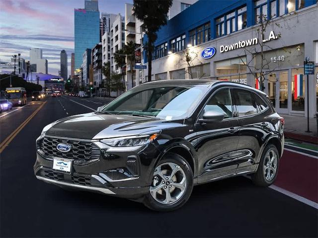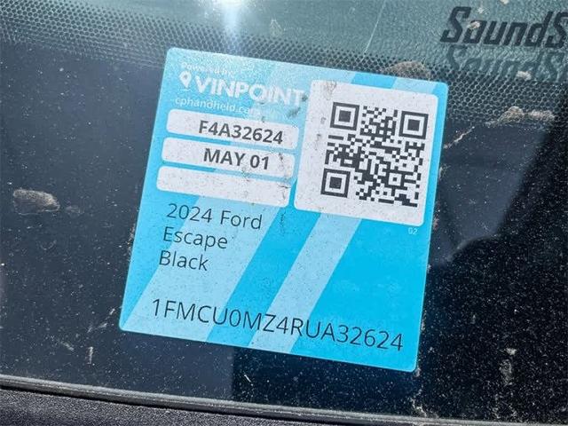 Agate Black Metallic 2024 Ford Escape Hybrid ST-Line FWD eCVT 2.5L iVCT 2.5L iVCT, 2.91 Axle Ratio, 3.81 Axle Ratio, 4-Wheel Disc Brakes, 6 Speakers, ABS brakes, Air Conditioning, Alloy wheels, AM/FM radio: SiriusXM, AM/FM Stereo, Auto High-beam Headlights, Automatic temperature control, Brake assist, Bumpers: body-color, Compass, Delay-off headlights, Driver door bin, Driver vanity mirror, Dual front impact airbags, Dual front side impact airbags, Electronic Fuel Door Release, Electronic Stability Control, Emergency communication system: SYNC 4 911 Assist, Equipment Group 301A, Exterior Parking Camera Rear, FordPass Connect, Four wheel independent suspension, Front & Rear Floor Liners w/Carpet Mats, Front anti-roll bar, Front Bucket Seats, Front Center Armrest, Front dual zone A/C, Front License Plate Bracket, Front reading lights, Fully automatic headlights, Illuminated entry, Knee airbag, Low tire pressure warning, Neutral Towing Capability, Occupant sensing airbag, Outside temperature display, Overhead airbag, Overhead console, Panic alarm, Passenger door bin, Passenger vanity mirror, Pedestrian Alert Sounder, Power door mirrors, Power driver seat, Power Liftgate, Power steering, Power windows, Radio data system, Rear anti-roll bar, Rear reading lights, Rear seat center armrest, Rear window defroster, Rear window wiper, Remote keyless entry, Roof rack: rails only, Speed control, Speed-sensing steering, Speed-Sensitive Wipers, Split folding rear seat, Spoiler, Sport steering wheel, Steering wheel mounted audio controls, SYNC 4, Tachometer, Telescoping steering wheel, Tilt steering wheel, Traction control, Trip computer, Variably intermittent wipers, Vinyl/Cloth Front Sport Contour Bucket Seats, Wheels: 18 Rock Metallic Painted Aluminum, 2.5L iVCT.
