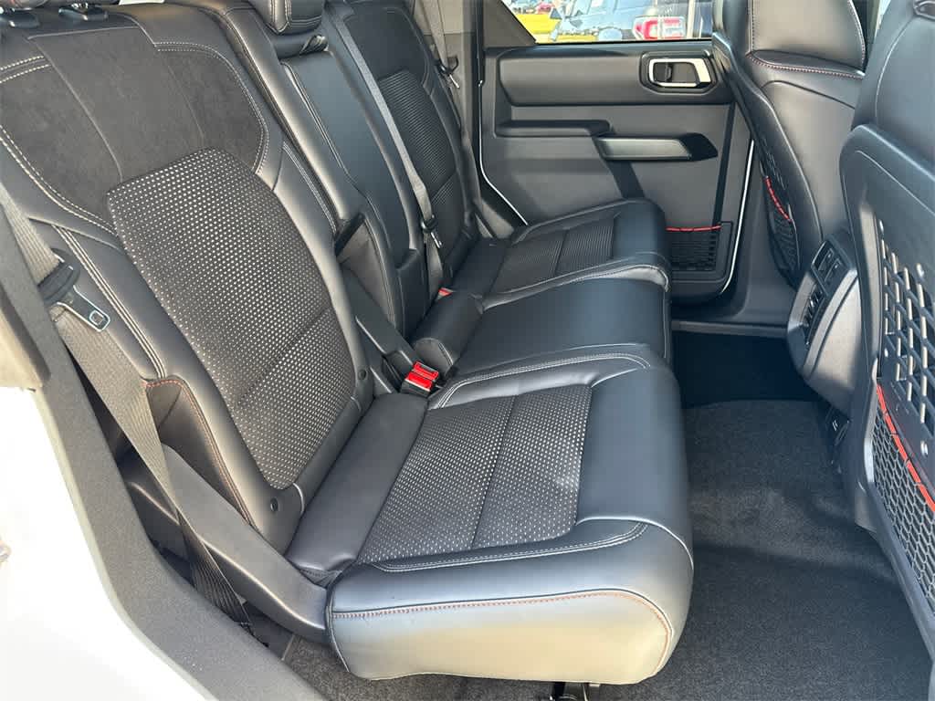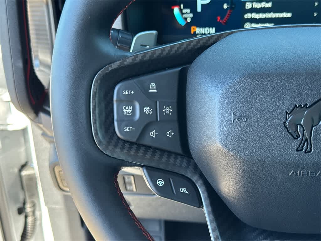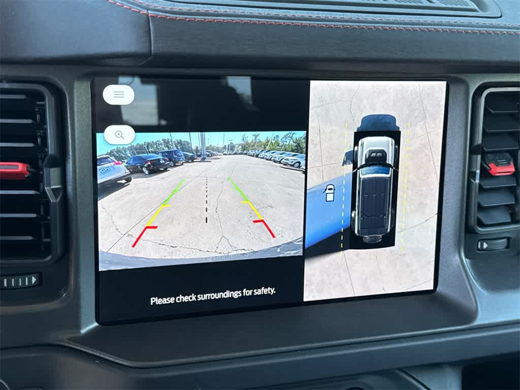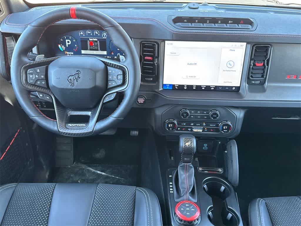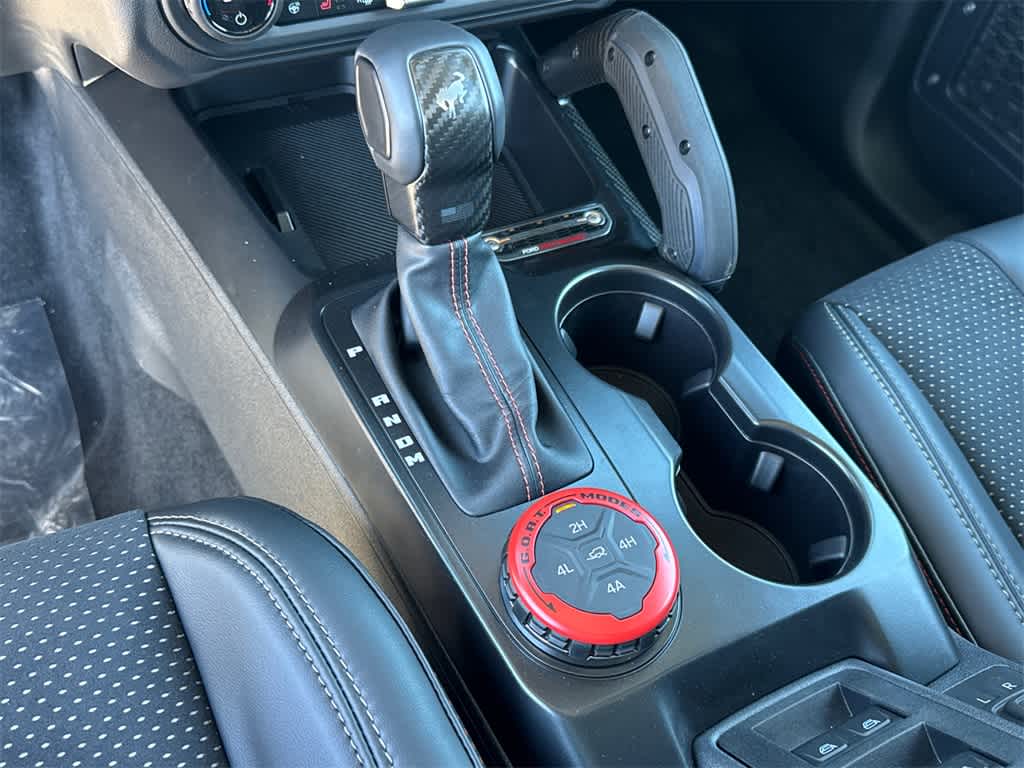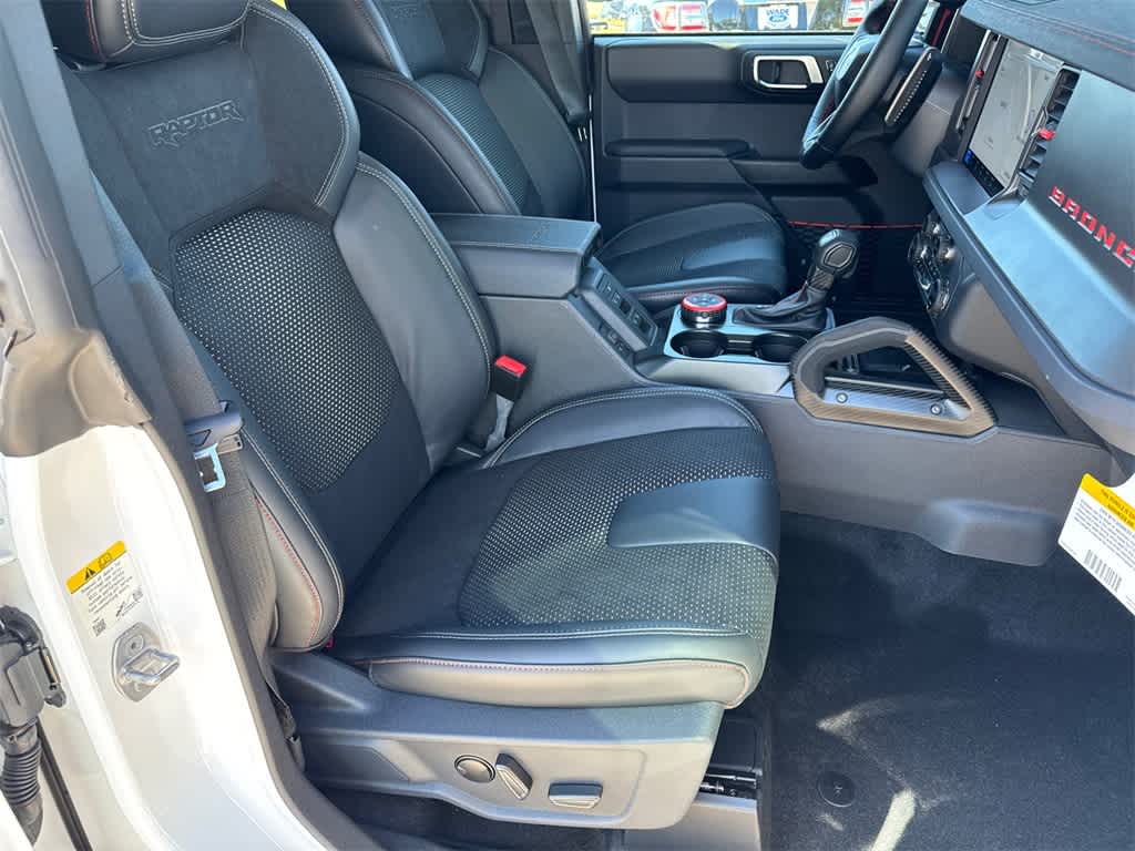 Bronco Raptor is nicely equipped with Equipment Group 374A Lux Package, 12 Speakers, 4-Wheel Disc Brakes, ABS brakes, Air Conditioning, Alloy wheels, AM/FM radio: SiriusXM with 360L, Auto High-beam Headlights, Auto-dimming Rear-View mirror, Automatic temperature control, Brake assist, Compass, Connected Navigation, Convertible HardTop, Convertible roof lining, Delay-off headlights, Driver door bin, Driver vanity mirror, Dual front impact airbags, Dual front side impact airbags, Electronic Stability Control, Emergency communication system: 911 Assist, Exterior Parking Camera Rear, Front anti-roll bar, Front Bucket Seats, Front Center Armrest, Front dual zone A/C, Front fog lights, Front reading lights, Front wheel independent suspension, Fully automatic headlights, Garage door transmitter, Glass rear window, Hard Top Sound Deadening Headliner, Heated door mirrors, Heated front seats, Heated steering wheel, Illuminated entry, Integrated roll-over protection, Interior Carbon Fiber Pack, Leather Shift Knob, Leather-Trimmed/Vinyl Bucket Seats, Low tire pressure warning, Marine Grade Vinyl Bucket Seats, Navigation system: Connected Navigation, Occupant sensing airbag, Outside temperature display, Overhead airbag, Overhead console, Panic alarm, Passenger door bin, Passenger vanity mirror, Power door mirrors, Power steering, Power windows, Radio data system, Radio: B&O Sound System by Bang & Olufsen, Rear anti-roll bar, Rear seat center armrest, Rear window defroster, Rear window wiper, Rear-Window Defroster & Washer, Remote keyless entry, Security system, Shadow Black Painted Hard Top, SiriusXM w/360L, Speed control, Split folding rear seat, Steering wheel mounted audio controls, SYNC 4, Tachometer, Telescoping steering wheel, Tilt steering wheel, Traction control, Trip computer, Turn signal indicator mirrors, Variably intermittent wipers, Voltmeter, Wheels: 17 Black High Gloss-Painted Aluminum, and Wheels: 17 Dark Carbonized Gray Alloy Painted.