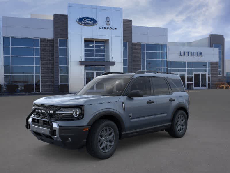 BLACK DIAMOND OFF-ROAD PACKAGE Deletes standard tire inflator and sealant kit and overhead console w/sunglasses storage, Brush Guard, Recovery Hooks, 2 casted in front and 2 D-ring in rear, 2nd Row Carpeted Seatback, rubberized seatback mat, Auxiliary Switches & Wiring, Class II Trailer Tow Pack w/Trailer Sway Control, full size spare wheel, full size spare tire and rubberized cargo floor, Underbody Protection, steel skid plate under engine and steel canister shield, Cargo Mat, Front & Rear Black Bumpers, Molded-in-color w/steel plates, Cargo Management System (Shelf/Divider/Table), Interior Grab Handle, 1 in the center floor console front row passenger side, Fender Tie Downs, 110V/400W AC Power Outlet, Behind center console and cargo area, Wheels: 17 Carbonized Gray Painted Aluminum, CONVENIENCE PACKAGE Heated 8-Way Power Drivers Seat, (Fore/aft, up/down, recline, lumbar), Front Driver/Passenger Seat Back Map Pockets, Universal Garage Door Opener (UGDO), Premium Wrapped Steering Wheel, LED Fog Lamps, POWER MOONROOF. 2025 Ford Bronco Sport with Azure Gray Metallic Tri-Coat exterior and Medium Light Smoked Truffle interior features a 3 Cylinder Engine with 181 HP at 6000 RPM*.