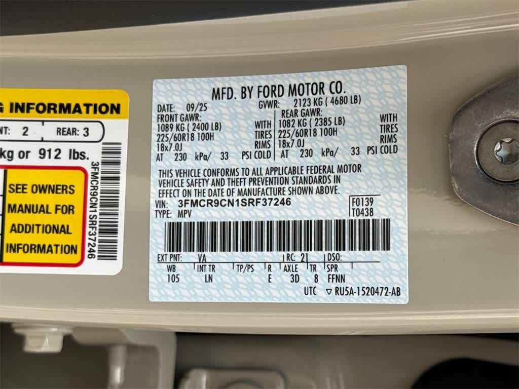 Bronco Sport Outer Banks is nicely equipped with Equipment Group 300A, 4-Wheel Disc Brakes, 6 Speakers, ABS brakes, Air Conditioning, Alloy wheels, AM/FM radio: SiriusXM, AM/FM Stereo, Auto High-beam Headlights, Auto-dimming Rear-View mirror, Automatic temperature control, Brake assist, Compass, Delay-off headlights, Driver door bin, Driver vanity mirror, Dual front impact airbags, Dual front side impact airbags, Electronic Stability Control, Emergency communication system: SYNC 4 911 Assist, Four wheel independent suspension, Front anti-roll bar, Front Bucket Seats, Front Center Armrest, Front Driver/Passenger Seat Back Map Pockets, Front dual zone A/C, Front fog lights, Front reading lights, Fully automatic headlights, Garage door transmitter, Heated door mirrors, Heated front seats, Heated steering wheel, Illuminated entry, Knee airbag, Low tire pressure warning, Memory seat, Occupant sensing airbag, Outside temperature display, Overhead airbag, Overhead console, Panic alarm, Passenger door bin, Passenger vanity mirror, Power door mirrors, Power driver seat, Power passenger seat, Power steering, Power windows, Premium Trimmed Front Bucket Seats w/Ebony/Roast, Premium Trimmed Front Bucket Seats w/Platinum Blue, Radio data system, Rain sensing wipers, Rear anti-roll bar, Rear Parking Sensors, Rear reading lights, Rear seat center armrest, Rear window defroster, Rear window wiper, Remote keyless entry, Security system, SiriusXM, Speed control, Speed-sensing steering, Speed-Sensitive Wipers, Split folding rear seat, Steering wheel mounted audio controls, SYNC 4 w/Enhanced Voice Recognition, Tachometer, Telescoping steering wheel, Tilt steering wheel, Traction control, Trip computer, Variably intermittent wipers, and Wheels: 18 Ebony Black-Painted Aluminum. Price includes: $2000 - Retail Customer Cash. Exp. 03/31/2026