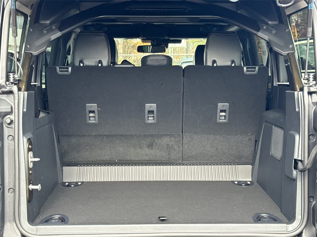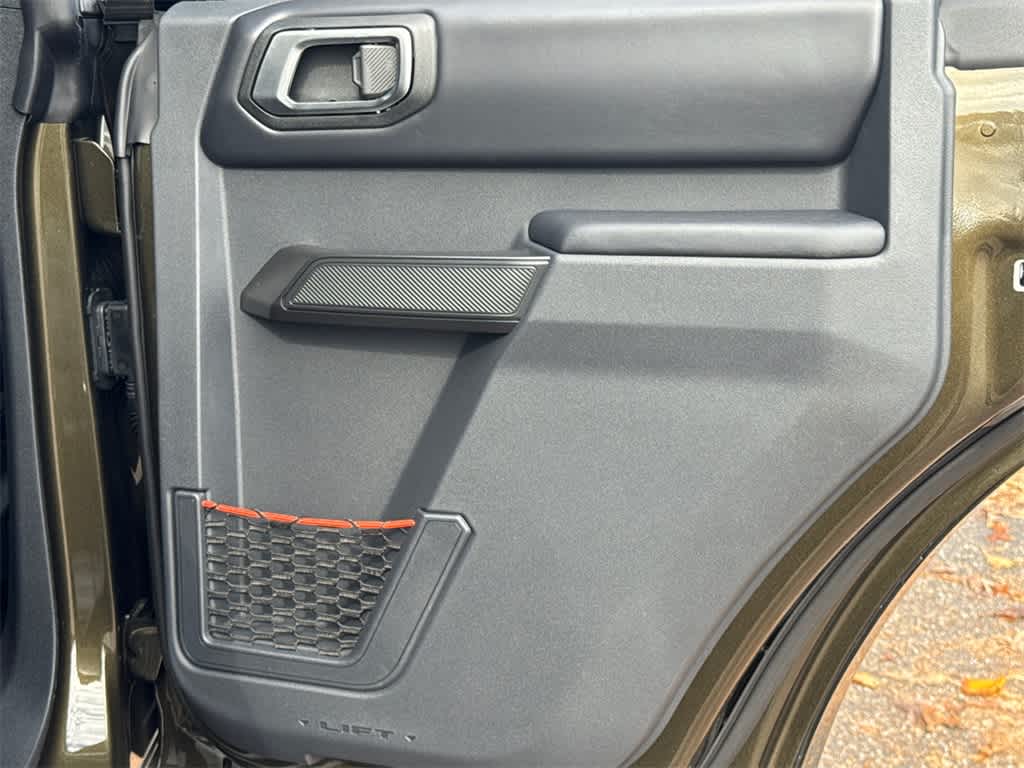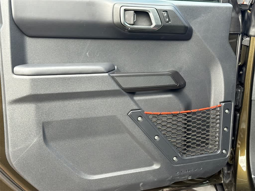 Bronco Raptor is nicely equipped with Equipment Group 374A Lux Package, 12 Speakers, 4-Wheel Disc Brakes, ABS brakes, Air Conditioning, Alloy wheels, AM/FM radio: SiriusXM with 360L, Auto High-beam Headlights, Auto-dimming Rear-View mirror, Automatic temperature control, Brake assist, Compass, Connected Navigation, Convertible HardTop, Convertible roof lining, Delay-off headlights, Driver door bin, Driver vanity mirror, Dual front impact airbags, Dual front side impact airbags, Electronic Stability Control, Emergency communication system: 911 Assist, Exterior Parking Camera Rear, Front anti-roll bar, Front Bucket Seats, Front Center Armrest, Front dual zone A/C, Front fog lights, Front reading lights, Front wheel independent suspension, Fully automatic headlights, Garage door transmitter, Glass rear window, Hard Top Sound Deadening Headliner, Heated door mirrors, Heated front seats, Heated steering wheel, Illuminated entry, Integrated roll-over protection, Leather Shift Knob, Leather-Trimmed/Vinyl Bucket Seats, Low tire pressure warning, Marine Grade Vinyl Bucket Seats, Navigation system: Connected Navigation, Occupant sensing airbag, Outside temperature display, Overhead airbag, Overhead console, Panic alarm, Passenger door bin, Passenger vanity mirror, Power door mirrors, Power steering, Power windows, Radio data system, Radio: B&O Sound System by Bang & Olufsen, Rear anti-roll bar, Rear seat center armrest, Rear window defroster, Rear window wiper, Rear-Window Defroster & Washer, Remote keyless entry, Security system, Shadow Black Painted Hard Top, SiriusXM w/360L, Speed control, Split folding rear seat, Steering wheel mounted audio controls, SYNC 4, Tachometer, Telescoping steering wheel, Tilt steering wheel, Traction control, Trip computer, Turn signal indicator mirrors, Variably intermittent wipers, Voltmeter, and Wheels: 17 Black High Gloss-Painted Aluminum.