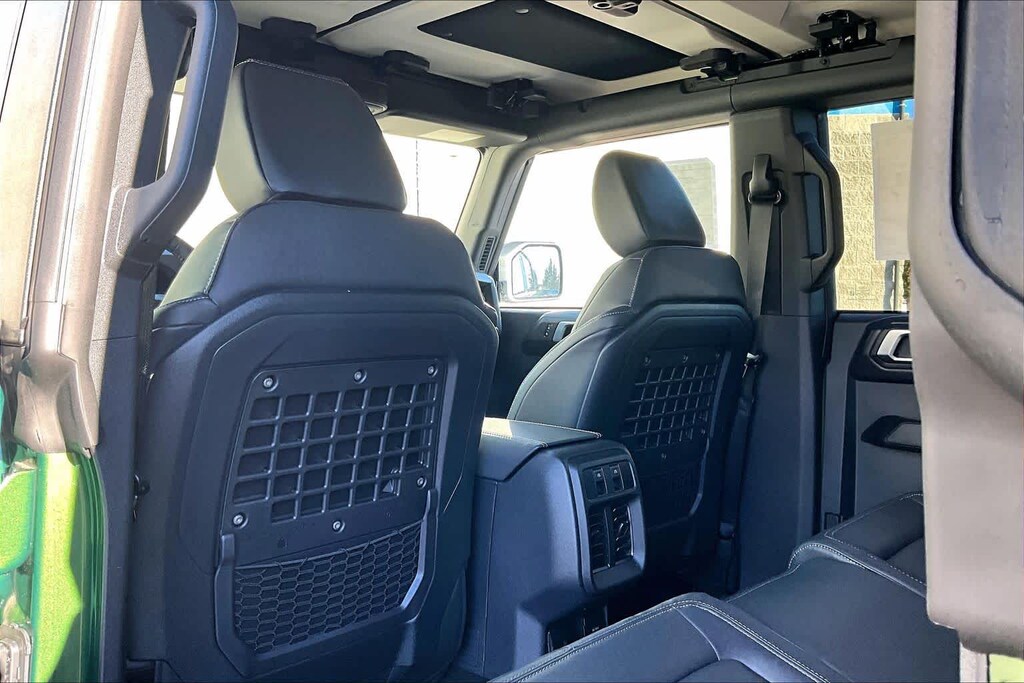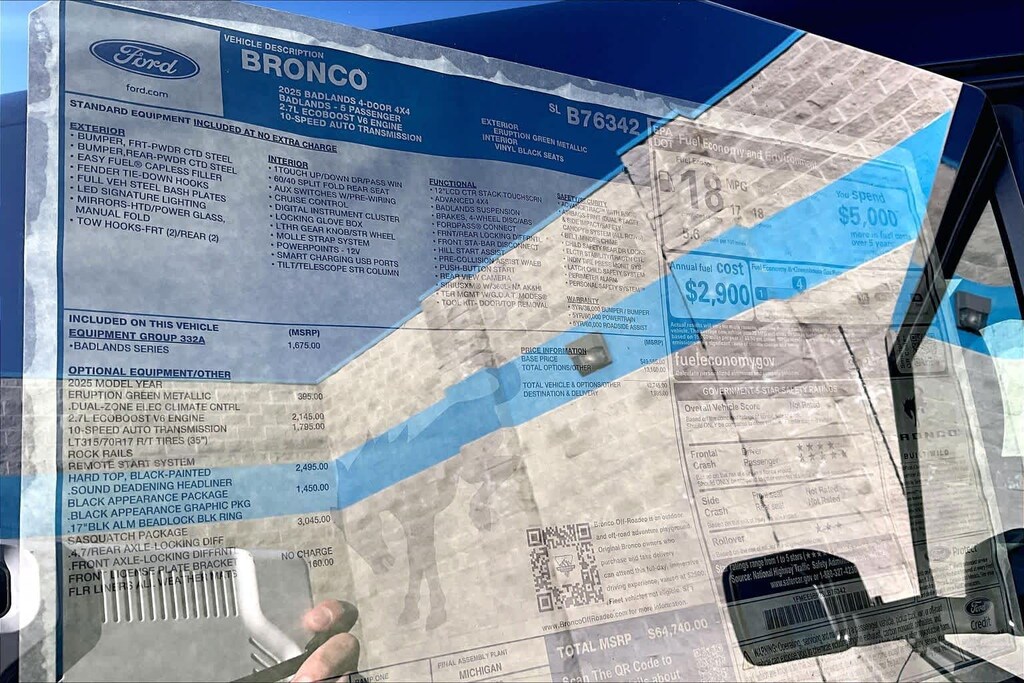 SASQUATCH PACKAGE Wheels: 17 Carbonized Gray Painted Aluminum, High Clearance Fender Flares, High Clearance Suspension, 4.7 Final Drive Ratio, electronic-locking front and rear axle, Tires: LT315/70R17 Rugged-Terrain, Position-Sensitive Bilstein Shock Absorbers, SHADOW BLACK PAINTED HARD TOP Hard Top Sound Deadening Headliner, Rear-Window Defroster & Washer, ENGINE: 2.7L ECOBOOST V6 GVWR: 6,180 lbs, TRANSMISSION: 10-SPEED AUTOMATIC remote start system, trail control, trail turn assist and trail one-pedal driving, 4.46 Axle Ratio, Rear HVAC, FRONT & REAR FLOOR LINERS W/O CARPET FLOOR MATS Custom accessory, pre-installed, Deletes carpet front and rear floor mats. Ford Badlands with Eruption Green exterior and Black Onyx interior features a V6 Cylinder Engine with 315 HP at 5500 RPM*.