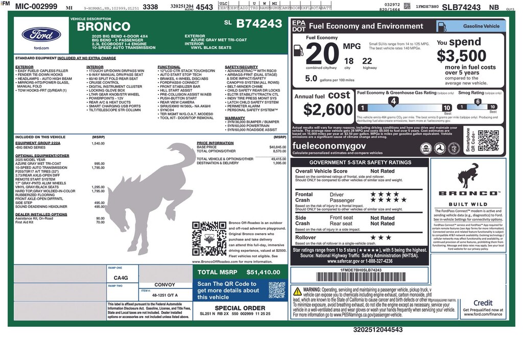 2025 Ford Bronco Big Bend Is nicely equipped with Equipment Group 222A Mid Package (2-Door Intelligent Access w/Lock/Unlock, Ambient Footwell Lighting, Connected Navigation, Dr & Pass Illuminated Sliding Visor Vanity Mirrors, Dual Smart Charging USB Ports, Dual-Zone Electronic Automatic Temperature Control, Front Row Heated Seats, Power Outlet - Back Side of Center Floor Console, and Rear Parking Sensors), 4-Wheel Disc Brakes, 4.46 Axle Ratio, 7 Speakers, ABS brakes, Air Conditioning, Alloy wheels, AM/FM radio: SiriusXM with 360L, AM/FM Stereo, Auto High-Beam Headlamps, Auto High-beam Headlights, BLIS Blind Spot Information System, Brake assist, Carbonized Gray Molded-In-Color Hard Top, Cloth Bucket Seats, Compass, Delay-off headlights, Driver door bin, Driver vanity mirror, Dual front impact airbags, Dual front side impact airbags, Electronic Stability Control, Emergency communication system: 911 Assist, Exterior Parking Camera Rear, First Aid Kit, Front anti-roll bar, Front Bucket Seats, Front Center Armrest, Front reading lights, Front wheel independent suspension, Fully automatic headlights, Hard Top Sound Deadening Headliner, Heated door mirrors, Illuminated entry, Integrated roll-over protection, Internet access capable: FordPass Connect, Lane-Keeping System, Leather Shift Knob, Low tire pressure warning, Occupant sensing airbag, Outside temperature display, Overhead airbag, Overhead console, Panic alarm, Passenger door bin, Passenger vanity mirror, Power door mirrors, Power steering, Power windows, Pre-Collision Assist w/Automatic Emergency Braking, Radio data system, Rear-View Camera, Rear-Window Defroster & Washer, Remote keyless entry, Security system, Side Step, SiriusXM w/360L, Speed control, Split folding rear seat, Steering wheel mounted audio controls, SYNC 4, Tachometer, Telescoping steering wheel, Tilt steering wheel, Traction control, Trip computer, Variably intermittent wipers, and Wheels: 17" Carbonized Gray-Painted Aluminum. Factory MSRP: $51,410 Dealer Discount of $3,190 off MSRP