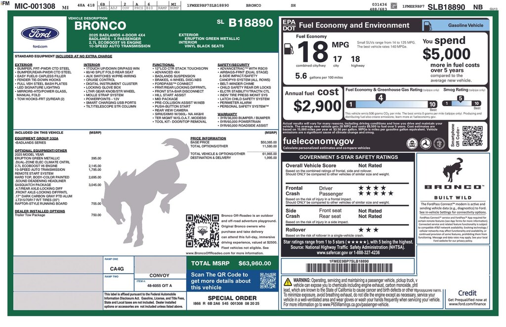 2025 Ford Bronco Badlands Is nicely equipped with Equipment Group 332A Mid Package (2-Door Intelligent Access w/Lock/Unlock, Ambient Footwell Lighting, Connected Navigation, Dr & Pass Illuminated Sliding Visor Vanity Mirrors, Dual Smart Charging USB Ports, Dual-Zone Electronic Automatic Temperature Control, Front Row Heated Seats, Power Outlet - Back Side of Center Floor Console, and Rear Parking Sensors), Sasquatch Package (High Clearance Fender Flares, High Clearance Suspension, Position-Sensitive Bilstein Shock Absorbers, and Wheels: 17" Carbonized Gray Painted Aluminum), 4-Wheel Disc Brakes, 7 Speakers, ABS brakes, Air Conditioning, Alloy wheels, AM/FM radio: SiriusXM with 360L, AM/FM Stereo, Auto High-Beam Headlamps, Auto High-beam Headlights, Auto-dimming Rear-View mirror, BLIS Blind Spot Information System, Body Color-Painted Hard Top, Brake assist, Compass, Delay-off headlights, Driver door bin, Driver vanity mirror, Dual front impact airbags, Dual front side impact airbags, Electronic Stability Control, Emergency communication system: 911 Assist, Exterior Parking Camera Rear, Front anti-roll bar, Front Bucket Seats, Front Center Armrest, Front fog lights, Front reading lights, Front wheel independent suspension, Fully automatic headlights, Hard Top Sound Deadening Headliner, Heated door mirrors, Heated front seats, Heated steering wheel, Illuminated entry, Integrated roll-over protection, Internet access capable: FordPass Connect, Lane-Keeping System, Leather Shift Knob, Low tire pressure warning, Marine Grade Vinyl Heated Bucket Seats, Occupant sensing airbag, Outside temperature display, Overhead airbag, Overhead console, Panic alarm, Passenger door bin, Passenger vanity mirror, Power door mirrors, Power steering, Power windows, Pre-Collision Assist w/Automatic Emergency Braking, Radio data system, Raptor-Style Running Board, Rear-View Camera, Rear-Window Defroster & Washer, Remote keyless entry, Security system, SiriusXM w/360L, Speed control, Split folding rear seat, Steering wheel mounted audio controls, SYNC 4, Tachometer, Telescoping steering wheel, Tilt steering wheel, Traction control, Trip computer, Variably intermittent wipers, Voltmeter, and Wheels: 17" Carbonized Gray-Painted Aluminum. Factory MSRP: $65,635 Dealer Discount of $4,815 off MSRP