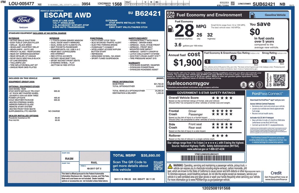2025 Ford Escape ST-Line Is nicely equipped with Cold Weather Package (Heated Front Row Seats, Heated Sideview Mirrors, Heated Steering Wheel, and Remote Starter System), Equipment Group 300A, AWD, 3.81 Axle Ratio, 4-Wheel Disc Brakes, 6 Speakers, ABS brakes, Air Conditioning, Alloy wheels, AM/FM radio: SiriusXM, AM/FM Stereo, Auto High-beam Headlights, Automatic temperature control, Brake assist, Bumpers: body-color, Compass, Delay-off headlights, Driver door bin, Driver vanity mirror, Dual front impact airbags, Dual front side impact airbags, Electronic Stability Control, Emergency communication system: SYNC 4 911 Assist, First Aid Kit, FordPass Connect, Four wheel independent suspension, Front anti-roll bar, Front Bucket Seats, Front Center Armrest, Front dual zone A/C, Front reading lights, Fully automatic headlights, Illuminated entry, Internet access capable: FordPass Connect 4G, Knee airbag, Low tire pressure warning, Occupant sensing airbag, Outside temperature display, Overhead airbag, Overhead console, Panic alarm, Passenger door bin, Passenger vanity mirror, Power door mirrors, Power driver seat, Power Liftgate, Power steering, Power windows, Radio data system, Rear anti-roll bar, Rear reading lights, Rear seat center armrest, Rear window defroster, Rear window wiper, Remote keyless entry, Road Side Assistance Kit, Speed control, Speed-sensing steering, Speed-Sensitive Wipers, Split folding rear seat, Spoiler, Sport steering wheel, Steering wheel mounted audio controls, SYNC 4, Tachometer, Telescoping steering wheel, Tilt steering wheel, Traction control, Trip computer, Variably intermittent wipers, Vinyl/Cloth Front Sport Contour Bucket Seats, and Wheels: 18" Rock Metallic Painted Aluminum. Factory MSRP: $35,880 Dealer Discount of $2,451 off MSRP Priced below KBB Fair Purchase Price!