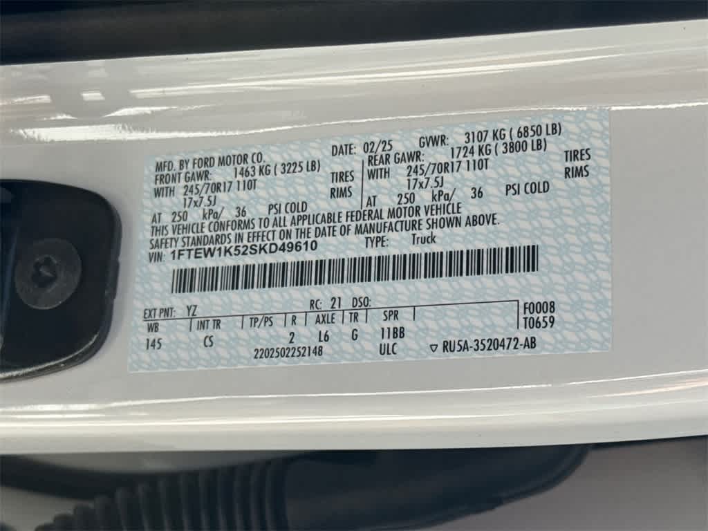 F-150 XL is nicely equipped with Equipment Group 101A Standard, GVWR: 6,426 lbs Payload Package, GVWR: 7,100 lbs Payload Package, Tow/Haul Package (Integrated Trailer Brake Controller), 4-Wheel Disc Brakes, 6 Speakers, ABS brakes, Air Conditioning, AM/FM radio: SiriusXM with 360L, Auto High-beam Headlights, Black Platform Running Boards, Brake assist, Cloth 40/20/40 Front Seat, Compass, Delay-off headlights, Driver door bin, Dual front impact airbags, Dual front side impact airbags, Electronic Stability Control, Emergency communication system: SYNC 4 911 Assist, Front anti-roll bar, Front Center Armrest, Front License Plate Bracket, Front reading lights, Front wheel independent suspension, Fully automatic headlights, Heated door mirrors, Illuminated entry, Low tire pressure warning, Occupant sensing airbag, Outside temperature display, Overhead airbag, Overhead console, Panic alarm, Passenger door bin, Passenger vanity mirror, Power door mirrors, Power steering, Power windows, Radio data system, Radio: AM/FM Stereo w/SiriusXM 360L, Rear Parking Sensors, Rear step bumper, Remote keyless entry, Security system, Speed control, Split folding rear seat, Steering wheel mounted audio controls, SYNC 4 w/Enhanced Voice Recognition, Tachometer, Telescoping steering wheel, Tilt steering wheel, Tough Bed Spray-In Bedliner, Traction control, Trip computer, Variably intermittent wipers, Voltmeter, and Wheels: 17 Silver Steel.