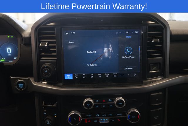 F-150 XLT is nicely equipped with Equipment Group 302A Mid (360 Degree Camera, 400W Cab & Bed Outlets, 6" Angular Bright Anodized Step Bar, Adaptive Cruise Control w/Stop & Go, Auto-Dimming Rear-View Mirror, Black Painted Grille w/Chrome Center Bar, Chrome Door & Tailgate Handles, Chrome Single-Tip Exhaust, Cloth 40/Console/40 Front Seats, Connected Navigation, Driver State Detection, Dual-Zone Electronic Automatic Temperature Control, Evasive Steering Assist, Ford Co-Pilot360 Assist 2.0, Front Parking Sensors, Heated Front Seats, Intelligent Access w/Push Button Start, Power Glass Heated Sideview Mirrors, Power-Sliding Rear Window, Remote Start System w/Remote Tailgate Release, Towing Technology, and Wrapped Steering Wheel), Mobile Office Package (Console Worksurface and Partitioned Lockable Rear Storage), 4-Wheel Disc Brakes, 6 Speakers, ABS brakes, Air Conditioning, Alloy wheels, AM/FM radio: SiriusXM with 360L, Auto High-beam Headlights, BlueCruise (Equipment + 1-Year Plan), Brake assist, Bumpers: chrome, Chrome wheels, Cloth 40/20/40 Front Seat, Compass, Delay-off headlights, Driver door bin, Driver vanity mirror, Dual front impact airbags, Dual front side impact airbags, Electronic Stability Control, Emergency communication system: SYNC 4 911 Assist, Front anti-roll bar, Front Center Armrest, Front fog lights, Front License Plate Bracket, Front reading lights, Front wheel independent suspension, Fully automatic headlights, Heated door mirrors, Illuminated entry, Internet access capable: FordPass Connect 5G, Low tire pressure warning, Occupant sensing airbag, Outside temperature display, Overhead airbag, Overhead console, Panic alarm, Passenger door bin, Passenger vanity mirror, Power door mirrors, Power steering, Power windows, Radio data system, Radio: AM/FM Stereo w/SiriusXM 360L, Rear Parking Sensors, Rear reading lights, Rear step bumper, Rear window defroster, Remote keyless entry, Security system, Speed control, Split folding rear seat, Steering wheel mounted audio controls, SYNC 4 w/Enhanced Voice Recognition, Tachometer, Telescoping steering wheel, Tilt steering wheel, Tough Bed Spray-In Bedliner, Traction control, Tray Style Floor Liner w/Carpet Mats, Trip computer, Variably intermittent wipers, Voltmeter, and Wheels: 18" Chrome-Like PVD.
