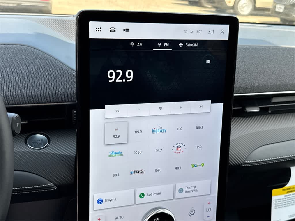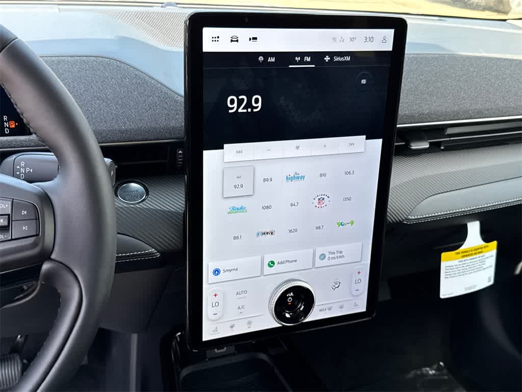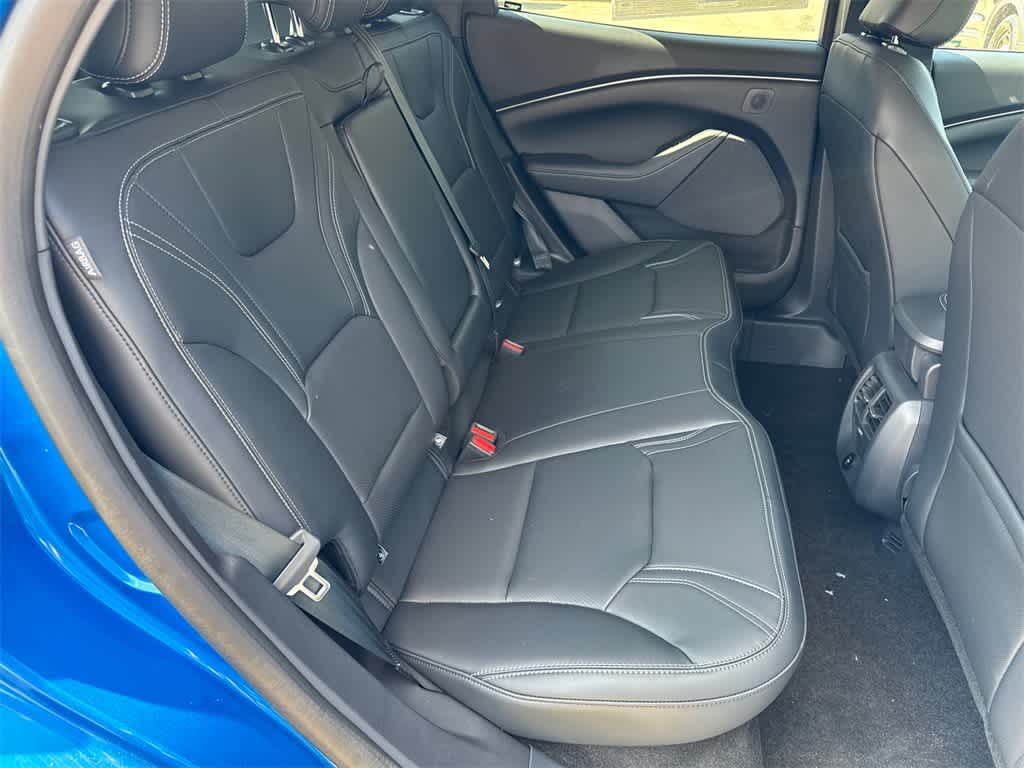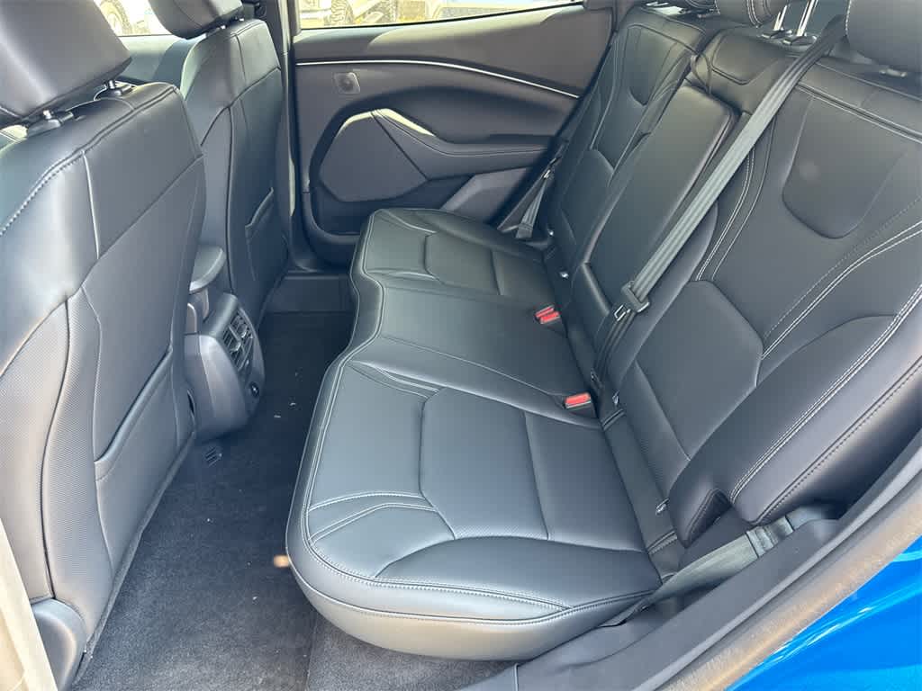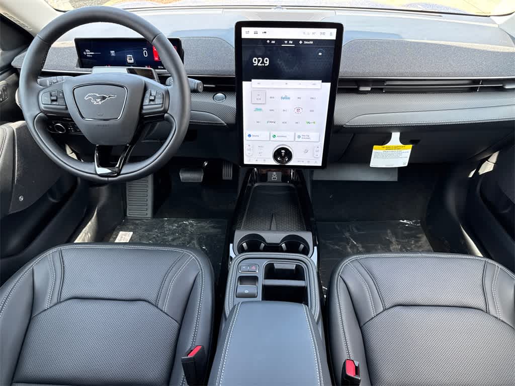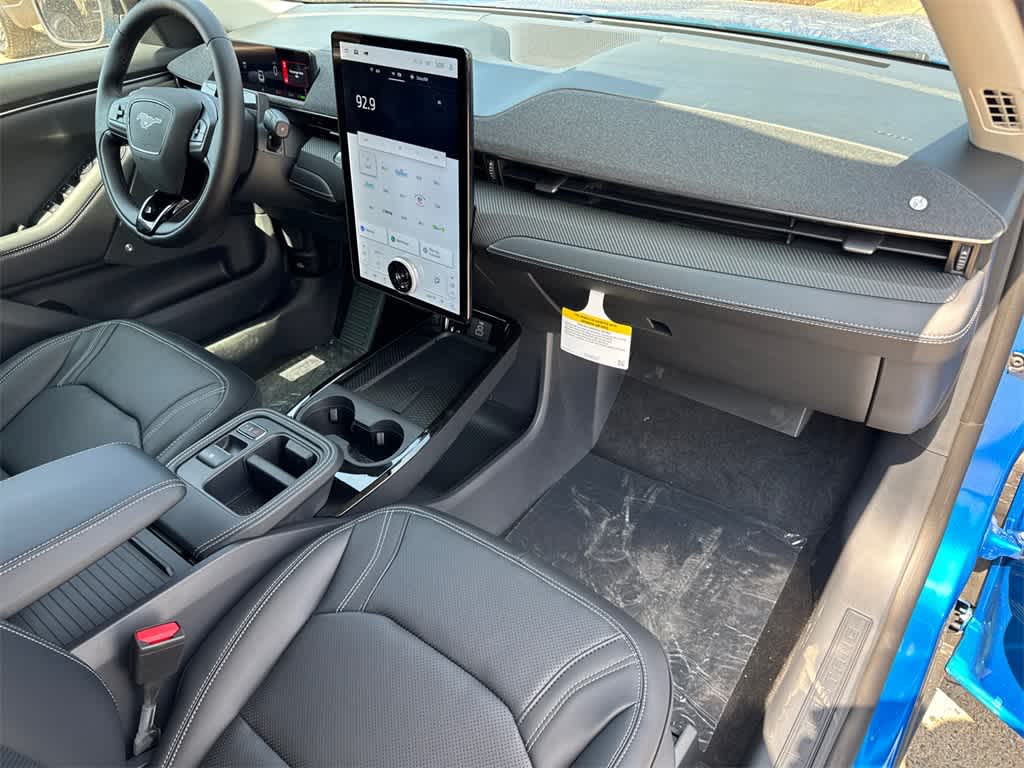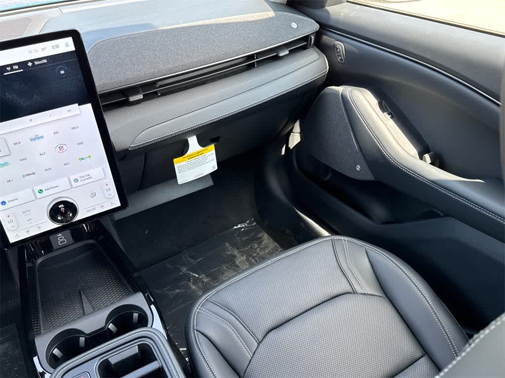 Mustang Mach-E Premium is nicely equipped with Equipment Group 300A Standard Package, 10 Speakers, 4-Wheel Disc Brakes, ABS brakes, Air Conditioning, Alloy wheels, AM/FM radio: SiriusXM with 360L, Apple CarPlay/Android Auto, Auto High-beam Headlights, Auto-dimming Rear-View mirror, Automatic temperature control, Brake assist, Bumpers: body-color, Compass, Delay-off headlights, Driver door bin, Driver vanity mirror, Dual front impact airbags, Dual front side impact airbags, Electronic Stability Control, Emergency communication system: 911 Assist, Exterior Parking Camera Rear, Four wheel independent suspension, Front anti-roll bar, Front Bucket Seats, Front Center Armrest, Front dual zone A/C, Front reading lights, Fully automatic headlights, Garage door transmitter, Heated door mirrors, Heated front seats, Heated steering wheel, Heated/Ventilated Perforated ActiveX Bucket Seats, Illuminated entry, Knee airbag, Low tire pressure warning, Memory seat, Mobile Power Cord (120V/240V), Navigation system: Connected Navigation, Occupant sensing airbag, Outside temperature display, Overhead airbag, Overhead console, Panic alarm, Passenger door bin, Passenger vanity mirror, Power door mirrors, Power driver seat, Power Liftgate, Power passenger seat, Power steering, Power windows, Radio data system, Radio: B&O Sound System by Bang & Olufsen, Rain sensing wipers, Rear anti-roll bar, Rear seat center armrest, Rear side impact airbag, Rear window defroster, Rear window wiper, Remote keyless entry, Security system, SiriusXM w/360L, Speed control, Speed-sensing steering, Speed-Sensitive Wipers, Split folding rear seat, Spoiler, Steering wheel mounted audio controls, SYNC 4A w/Enhanced Voice Recognition, Telescoping steering wheel, Tilt steering wheel, Traction control, Trip computer, Turn signal indicator mirrors, Variably intermittent wipers, Ventilated front seats, and Wheels: 19 Bright Machined-Face Aluminum.