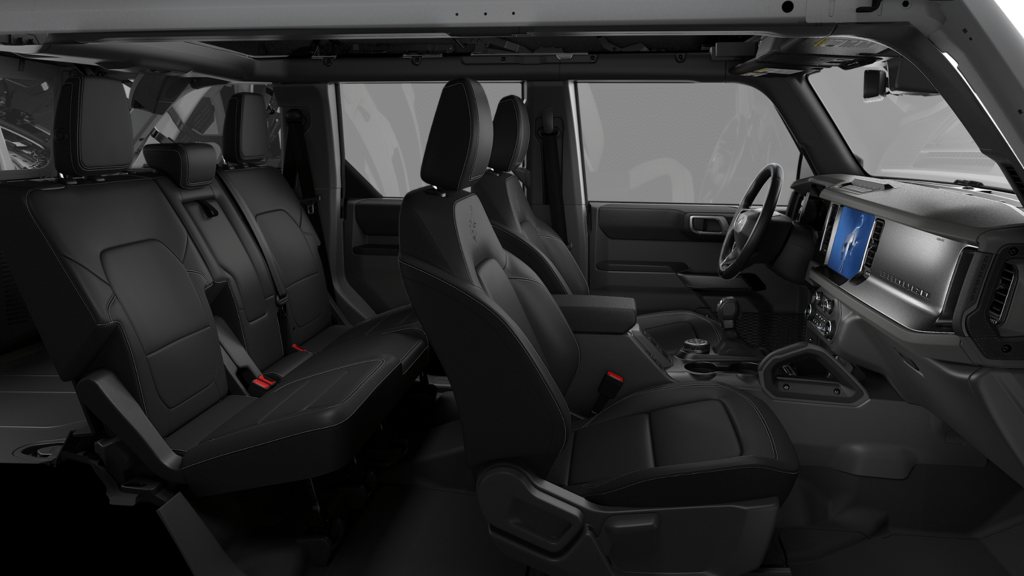 Bronco Outer Banks Advanced is nicely equipped with Equipment Group 314A Lux Package (18" Bright Machined Aluminum Wheels, 360-Degree Camera, Adaptive Cruise Control, Evasive Steering Assist, Front Parking Sensors, Heated Leather-Trimmed/Vinyl Bucket Seats, Information on Demand Panel, and Sideview Mirrors), Ford Connectivity Package (1-Year Included), Sasquatch Package (High Clearance Fender Flares, High Clearance Suspension, Position-Sensitive Bilstein Shock Absorbers, and Wheels: 17" Matte Black Alloy), 4-Wheel Disc Brakes, 7 Speakers, ABS brakes, Air Conditioning, Alloy wheels, AM/FM radio: SiriusXM with 360L, AM/FM Stereo, Auto High-beam Headlights, Auto-dimming Rear-View mirror, Automatic temperature control, Brake assist, Carbonized Gray Molded-in-Color Hard Top, Compass, Connected Navigation, Delay-off headlights, Driver door bin, Driver vanity mirror, Dual front impact airbags, Dual front side impact airbags, Electronic Stability Control, Emergency communication system: 911 Assist, Exterior Parking Camera Rear, Front anti-roll bar, Front Bucket Seats, Front Center Armrest, Front dual zone A/C, Front fog lights, Front reading lights, Front Row Top Panels and Door Storage Bags, Front wheel independent suspension, Fully automatic headlights, Hard Top Sound Deadening Headliner, Heated door mirrors, Heated front seats, Heated steering wheel, Illuminated entry, Integrated roll-over protection, Leather Shift Knob, Low tire pressure warning, Navigation system: Connected Navigation, Occupant sensing airbag, Outside temperature display, Overhead airbag, Overhead console, Panic alarm, Passenger door bin, Passenger vanity mirror, Power door mirrors, Power driver seat, Power passenger seat, Power steering, Power windows, Radio data system, Rear seat center armrest, Rear-Window Defroster and Washer, Remote keyless entry, Security system, SiriusXM with 360L, Speed control, Split folding rear seat, Steering wheel mounted audio controls, SYNC 4, Tachometer, Telescoping steering wheel, Tilt steering wheel, Traction control, Trip computer, Variably intermittent wipers, and Voltmeter.