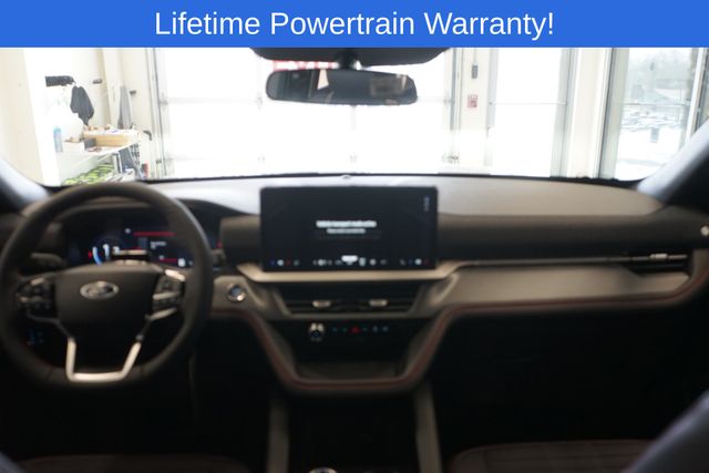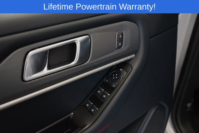 Explorer ST-Line is nicely equipped with 10 Speakers, 3rd row seats: bench, 4-Wheel Disc Brakes, ABS brakes, Air Conditioning, Alloy wheels, AM/FM radio: SiriusXM with 360L, Apple CarPlay/Android Auto, Auto High-beam Headlights, Automatic temperature control, Brake assist, Bumpers: body-color, Compass, Delay-off headlights, Driver door bin, Driver vanity mirror, Dual front impact airbags, Dual front side impact airbags, Electronic Stability Control, Emergency communication system: 911 Assist, Exterior Parking Camera Rear, Four wheel independent suspension, Front anti-roll bar, Front Bucket Seats, Front Center Armrest, Front dual zone A/C, Front fog lights, Front reading lights, Fully automatic headlights, Garage door transmitter, Heated door mirrors, Heated front seats, Heated steering wheel, Heated Unique Cloth Captain's Chairs, Illuminated entry, Knee airbag, Leather steering wheel, Low tire pressure warning, Navigation System, Occupant sensing airbag, Outside temperature display, Overhead airbag, Overhead console, Panic alarm, Passenger door bin, Passenger vanity mirror, Power door mirrors, Power driver seat, Power Liftgate, Power passenger seat, Power steering, Power windows, Radio: B&O Sound System by Bang and Olufsen, Rear air conditioning, Rear anti-roll bar, Rear reading lights, Rear window defroster, Rear window wiper, Remote keyless entry, Security system, Speed control, Speed-sensing steering, Speed-Sensitive Wipers, Split folding rear seat, Spoiler, Steering wheel mounted audio controls, Tachometer, Telescoping steering wheel, Tilt steering wheel, Traction control, Trip computer, Variably intermittent wipers, and Wheels: 20" Ebony-Painted Machined Aluminum.