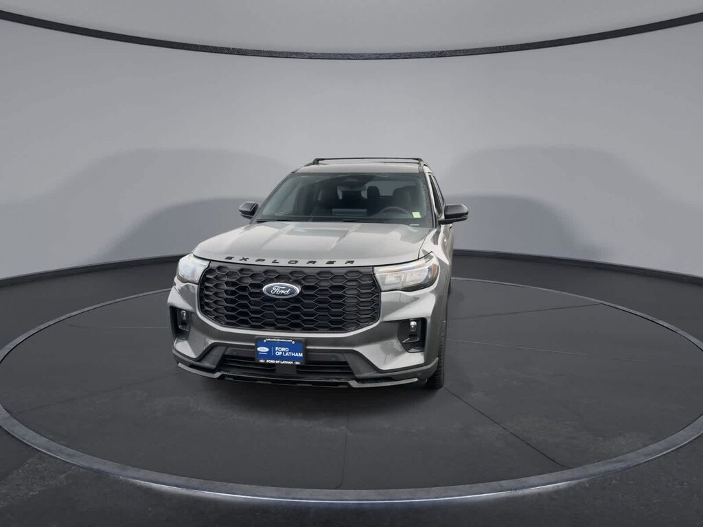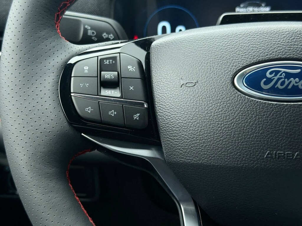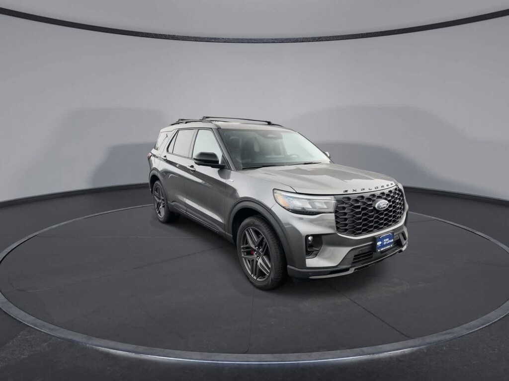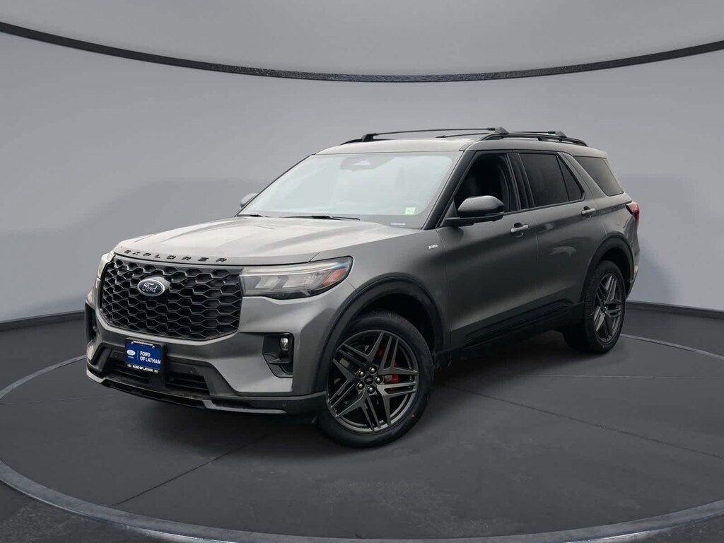 Explorer ST-Line is nicely equipped with Equipment Group 300A Standard Package (Heated Unique Cloth Captains Chairs, Radio: B&O Sound System by Bang and Olufsen, and Wheels: 20 Ebony-Painted Machined Aluminum), Premium Package (110V/150W AC Power Outlet, 2nd Row Heated Seats, Ambient Lighting, Auto-Dimming Interior Rear-View Mirror, Manual-Folding Sideview Mirrors, Memory Drivers Seat, and Rain-Sensing Wipers (front Only)), ST-Line Street Pack (Performance Brakes, Red Painted Performance Front and Rear Brake Calipers, and Wheels: 21 Magnetite-Painted Aluminum), 10 Speakers, 2nd Row Captains Chairs w/E-Z Entry and Armrest, 3rd row seats: bench, 4-Wheel Disc Brakes, ABS brakes, Air Conditioning, Alloy wheels, AM/FM radio: SiriusXM with 360L, Apple CarPlay/Android Auto, Auto High-beam Headlights, Automatic temperature control, BlueCruise (equipment + 1-Year + 90-Day Plan), BlueCruise Hardware, Brake assist, Bumpers: body-color, Compass, Delay-off headlights, Driver door bin, Driver vanity mirror, Dual front impact airbags, Dual front side impact airbags, Electronic Stability Control, Emergency communication system: 911 Assist, Exterior Parking Camera Rear, Four wheel independent suspension, Front and 2nd Rows Floor Liners with Carper Floor Mats, Front anti-roll bar, Front Bucket Seats, Front Center Armrest, Front dual zone A/C, Front fog lights, Front License Plate Bracket, Front reading lights, Fully automatic headlights, Garage door transmitter, Heated door mirrors, Heated front seats, Heated steering wheel, Illuminated entry, Knee airbag, Leather steering wheel, Low tire pressure warning, Navigation System, Occupant sensing airbag, Outside temperature display, Overhead airbag, Overhead console, Panic alarm, Panoramic Fixed Glass Roof with Power Shade, Passenger door bin, Passenger vanity mirror, Power door mirrors, Power driver seat, Power Liftgate, Power passenger seat, Power steering, Power windows, Rear air conditioning, Rear anti-roll bar, Rear reading lights, Rear window defroster, Rear window wiper, Remote keyless entry, SecuriCode Keyless Entry Keypad, Security system, Speed control, Speed-sensing steering, Speed-Sensitive Wipers, Split folding rear seat, Spoiler, Steering wheel mounted audio controls, Tachometer, Telescoping steering wheel, Tilt steering wheel, Traction control, Trip computer, and Variably intermittent wipers.
