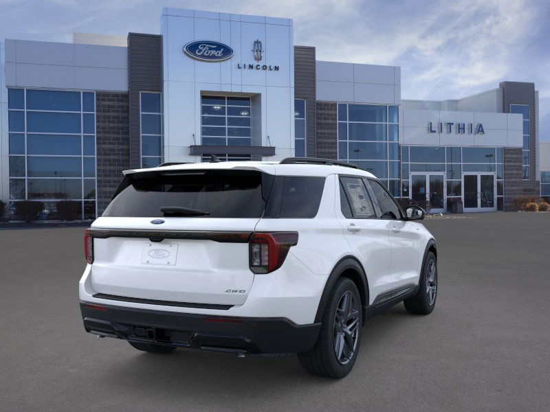 ST-LINE STREET PACK Wheels: 21 Magnetite-Painted Aluminum, Tires: P275/45R21 AS BSW, Performance Brakes, Red Painted Perf Front & Rear Brake Calipers, PREMIUM PACKAGE 110V/150W AC Power Outlet, Replaces the powerpoint port on the rear side of the center floor console, Auto-Dimming Interior Rearview Mirror, Memory Drivers Seat, Manual-Folding Sideview Mirrors, power and heated glass, LED turn signal indicators, security approach lamps, drivers side auto-dimming and driver and passenger side memory, Rain-Sensing Wipers (Front Only), Ambient Lighting, 2nd Row Heated Seats, 18 SPARE WHEEL & JACK KIT 18 spare tire, TRANSMISSION: 10-SPEED AUTOMATIC (STD). 2026 Ford Explorer with Star White Metallic Tri-Coat exterior and Onyx interior features a 4 Cylinder Engine with 300 HP at 5500 RPM*.