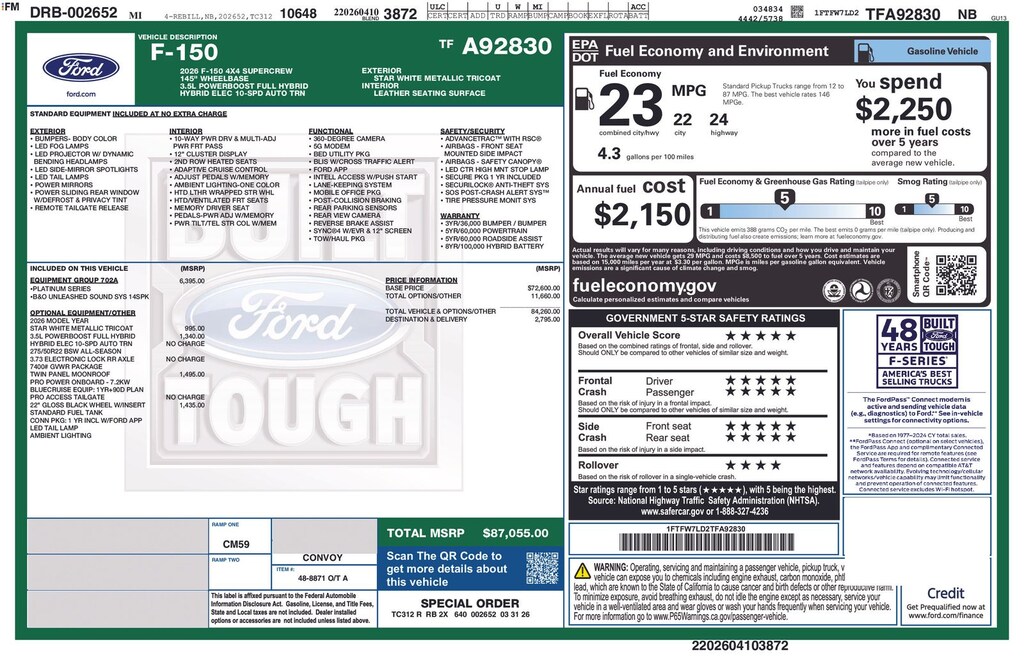 Recent Arrival! 2026 Ford F-150 Platinum Is nicely equipped with Equipment Group 702A High (Power-Deployable Running Boards, Radio: B&O Unleashed Sound System by Bang & Olufsen, Unique Multi-Contour Leather Bucket Seats, and Wheels: 20" Painted Gloss Ebony Black), Ford Connectivity Package (1-Year Included), GVWR: 7,400 lbs Payload Package, Internet access capable: 5G Modem - Ford Connectivity Package, 3.5L PowerBoost Full-Hybrid V6, 4WD, 4-Wheel Disc Brakes, 8 Speakers, ABS brakes, Adjustable pedals, Air Conditioning, Alloy wheels, AM/FM radio: SiriusXM with 360L, Auto High-beam Headlights, Auto tilt-away steering wheel, Auto-dimming door mirrors, Auto-dimming Rear-View mirror, Automatic temperature control, Brake assist, Bumpers: body-color, Compass, Delay-off headlights, Driver door bin, Driver vanity mirror, Dual front impact airbags, Dual front side impact airbags, Electronic Stability Control, Emergency communication system: SYNC 4 911 Assist, Front anti-roll bar, Front Bucket Seats, Front Center Armrest, Front dual zone A/C, Front fog lights, Front reading lights, Front wheel independent suspension, Fully automatic headlights, Garage door transmitter, Heated door mirrors, Heated front seats, Heated rear seats, Heated steering wheel, Illuminated entry, Leather steering wheel, Low tire pressure warning, Memory seat, Navigation system: Connected Navigation, Occupant sensing airbag, Outside temperature display, Overhead airbag, Overhead console, Panic alarm, Passenger door bin, Passenger vanity mirror, Pedal memory, Power door mirrors, Power driver seat, Power passenger seat, Power steering, Power windows, Pro Access Tailgate, Radio data system, Radio: B&O Sound System by Bang and Olufsen, Rain sensing wipers, Rear reading lights, Rear seat center armrest, Rear step bumper, Rear window defroster, Remote keyless entry, Security system, Speed control, Split folding rear seat, Steering wheel memory, Steering wheel mounted audio controls, SYNC 4 with Enhanced Voice Recognition, Tachometer, Telescoping steering wheel, Tilt steering wheel, Traction control, Trip computer, Turn signal indicator mirrors, Twin Panel Moonroof, Variably intermittent wipers, and Ventilated front seats. Factory MSRP: $87,055 Dealer Discount of $8,872 off MSRP