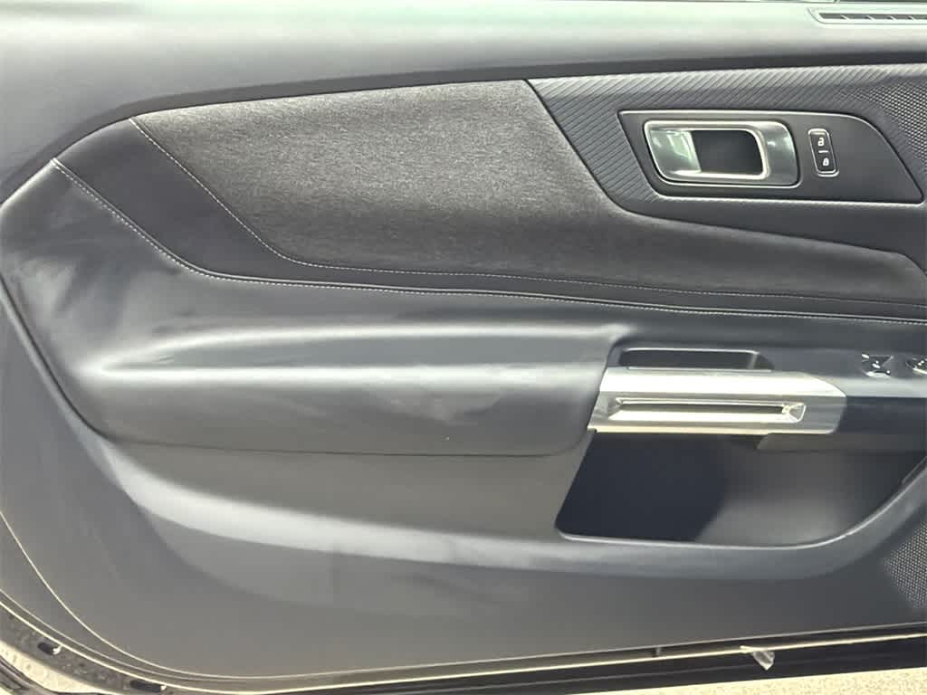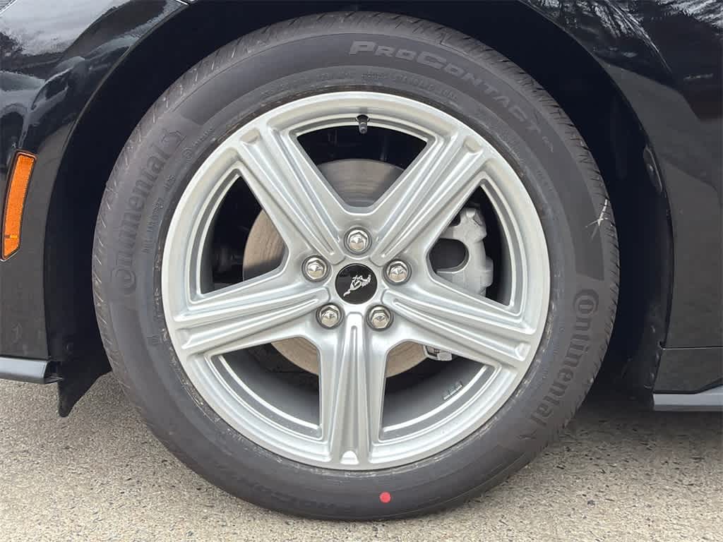 Mustang EcoBoost is nicely equipped with 1st Row Carpeted Black Floor Mats, 4-Wheel Disc Brakes, ABS brakes, Air Conditioning, Alloy wheels, AM/FM Stereo, Auto High-beam Headlights, Automatic temperature control, Brake assist, Bumpers: body-color, Compass, Delay-off headlights, Driver door bin, Driver vanity mirror, Dual front impact airbags, Dual front side impact airbags, Electronic Stability Control, Emergency communication system: 911 Assist, Exterior Parking Camera Rear, Four wheel independent suspension, Front anti-roll bar, Front Bucket Seats, Front Center Armrest, Front dual zone A/C, Front reading lights, Fully automatic headlights, Illuminated entry, Knee airbag, Leather Shift Knob, Low tire pressure warning, Occupant sensing airbag, Outside temperature display, Overhead airbag, Overhead console, Panic alarm, Passenger door bin, Passenger vanity mirror, Power door mirrors, Power steering, Power windows, Radio data system, Rain sensing wipers, Rear anti-roll bar, Rear Parking Sensors, Rear window defroster, Remote keyless entry, Speed control, Speed-sensing steering, Speed-Sensitive Wipers, Split folding rear seat, Sport steering wheel, Steering wheel mounted audio controls, SYNC 4, Tachometer, Telescoping steering wheel, Tilt steering wheel, Traction control, Trip computer, Variably intermittent wipers, and Voltmeter.
