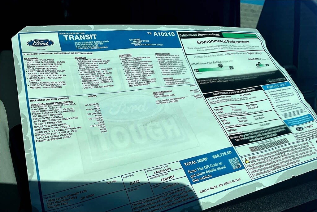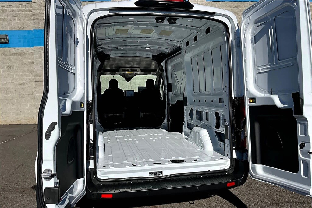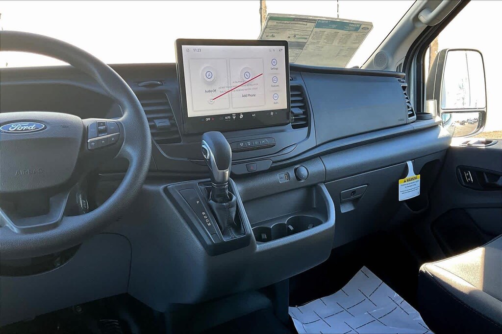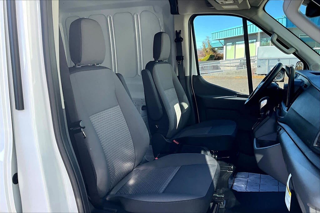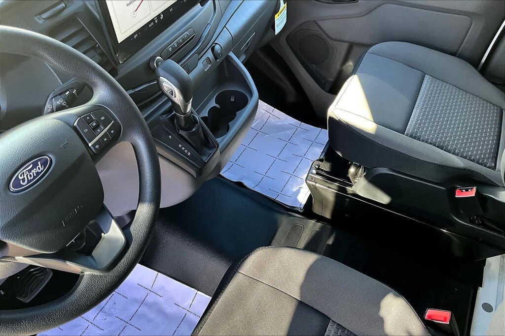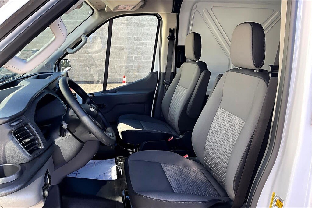 DARK PALAZZO GRAY CLOTH BUCKET SEATS W/ARMRESTS 2-way manual driver seat w/lumbar and 2-way manual passenger seat, TRANSMISSION: 10-SPD AUTOMATIC W/OD & SELECTSHIFT auxiliary transmission oil cooler (STD). Ford Transit Cargo Van with Oxford White exterior and Dark Palazzo Gray interior features a V6 Cylinder Engine with 275 HP at 6250 RPM*.