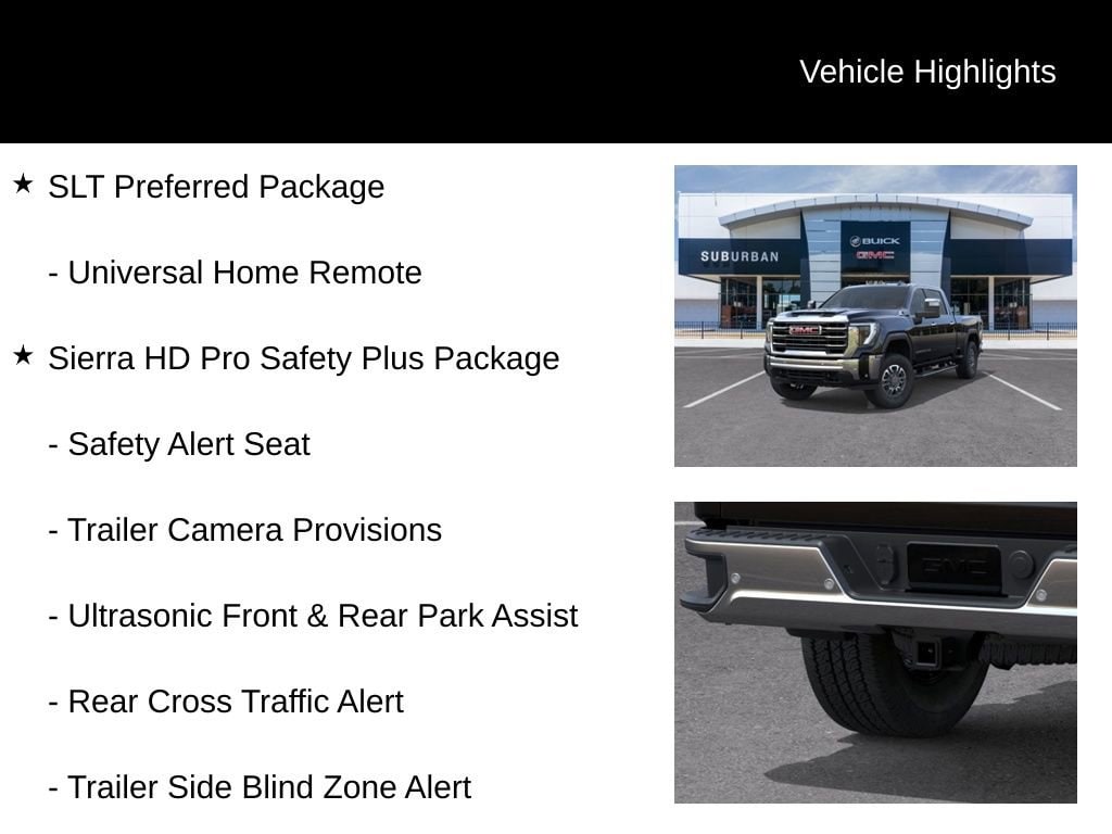 New Price! Onyx Black 2025 GMC Sierra 3500HD SLT 4WD 10-Speed Automatic 6.6L V8 10-Speed Automatic, 4WD, Black Leather, 120-Volt Bed Mounted Power Outlet, 120-Volt Instrument Panel Power Outlet, 2 Charge-Only Rear USB Ports, 2 Charge/Data USB Ports, 2 Charge/Data USB Ports Inside Center Console, 2-Speed Active Transfer Case, 220 Amp Alternator, 6-Speaker Audio System Feature, 6 Rectangular Chromed Tubular Assist Steps, Adaptive Cruise Control, Bed View Camera w/2 Trailer Camera Provisions, Bose Premium 7-Speaker Sound System, Chrome Surround Grille w/Chrome Insert Bars, Deep-Tinted Glass, Electric Rear-Window Defogger, Floor-Mounted Center Console, Front Bucket Seats, Front Rain-Sensing Wipers, HD Surround Vision, Heated 2nd Row Outboard Seats, Heated Driver & Front Outboard Passenger Seats, Keyless Open & Start, LED Cargo Area Lighting, Manual Tilt-Wheel/Telescoping Steering Column, Power Front Windows w/Passenger Express Up/Down, Power Sliding Rear Window w/Defogger, Preferred Equipment Group 4SA, Push Button Start, Rear Cross Traffic Alert, Remote Vehicle Starter System, Safety Alert Seat, Sierra HD Pro Safety Plus Package, SiriusXM w/360L Trial Subscription, SLT Convenience Package, SLT Preferred Package, SLT Premium Package, Snow Plow Prep/Camper Package, Spray-On Pickup Bedliner w/GMC Logo, Steering Wheel Audio Controls, Suspension Package, Trailer Camera Provisions, Trailer Side Blind Zone Alert, Ultrasonic Front & Rear Park Assist, Unauthorized Entry Theft-Deterrent System, Universal Home Remote, Ventilated Driver & Front Passenger Seats, Wireless Charging, Wireless Phone Projection.