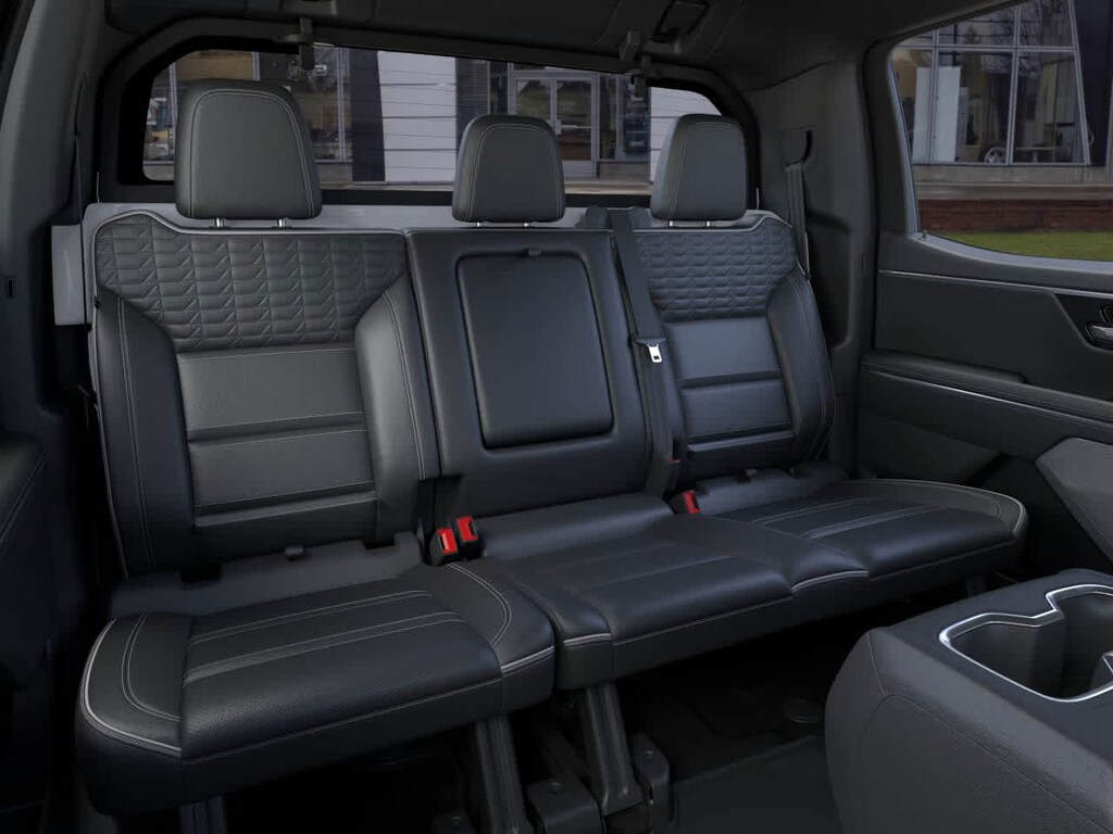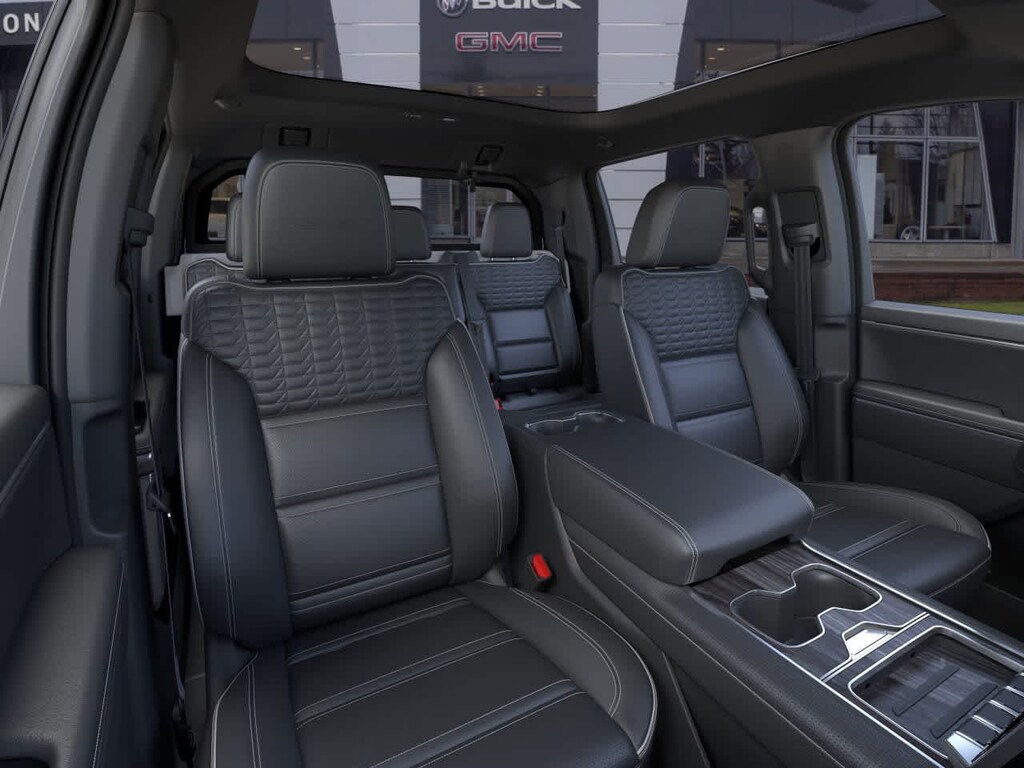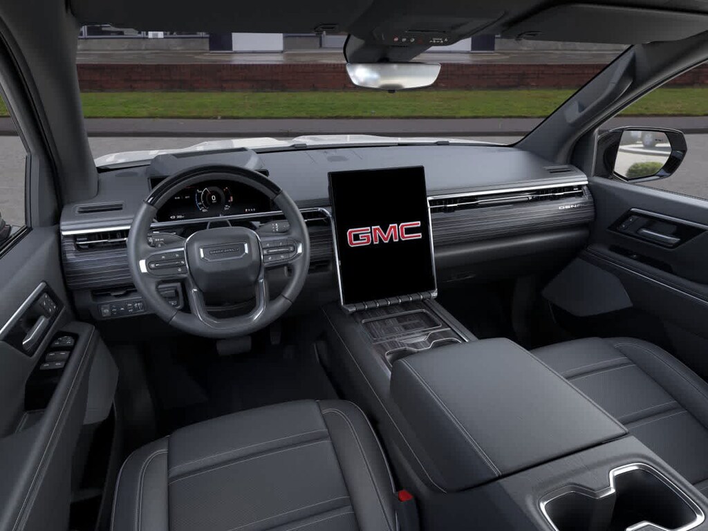 Navigation, Panoramic Roof, 4x4, Rear Air, Heated Driver Seat, Heated Rear Seat, Cooled Driver Seat, Back-Up Camera, Running Boards, Premium Sound System, Satellite Radio, iPod/MP3 Input, Onboard Communications System, Trailer Hitch, Aluminum Wheels. GMC Max Range Denali with Summit White exterior and After Dark (Black) interior features a Electric Motor. MP3 Player, Privacy Glass, Keyless Entry, Steering Wheel Controls, Child Safety Locks.