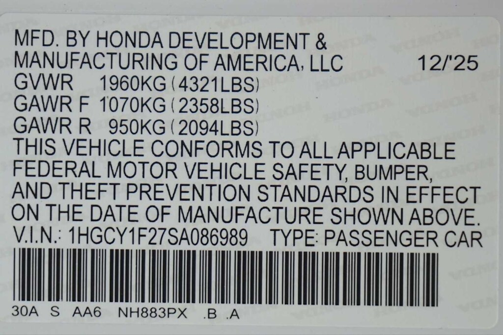 - 1HGCY1F27SA086989