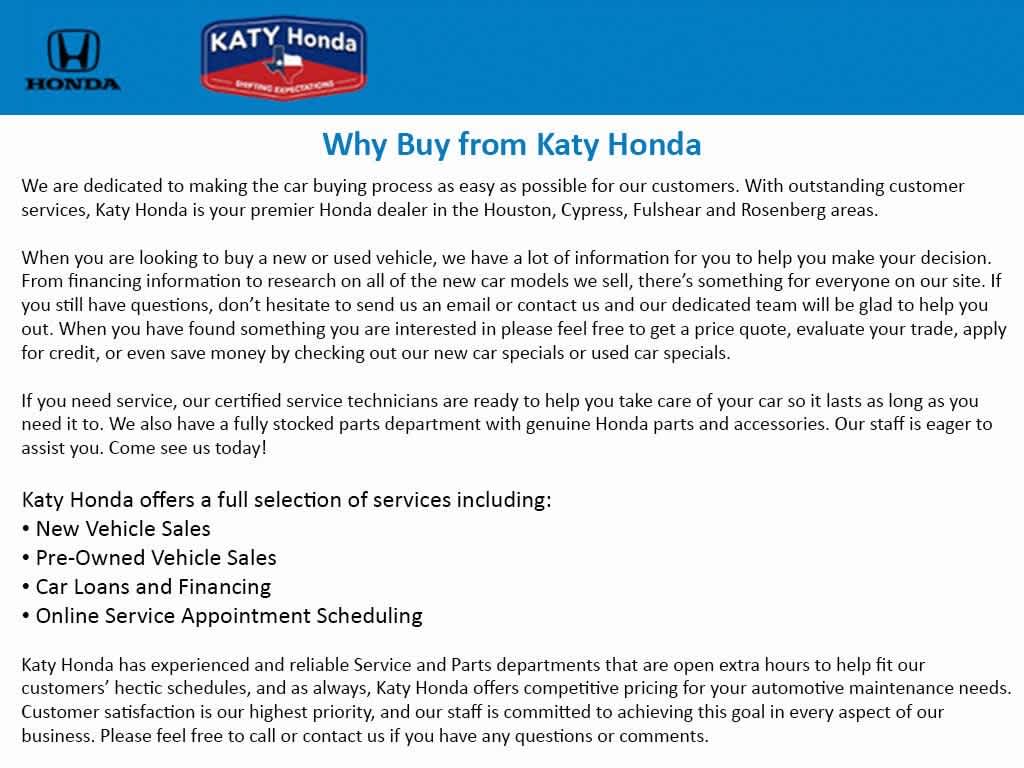 When you are looking to buy a new or used vehicle, Katy Honda has a lot of information for you to help you make your decision. From financing information to research on all of the new car models we sell, theres something for everyone on our site. If you still have questions, dont hesitate to send us an email or contact us and our dedicated team will be glad to help you out. When you have found something you are interested in please feel free to get a price quote and evaluate your trade