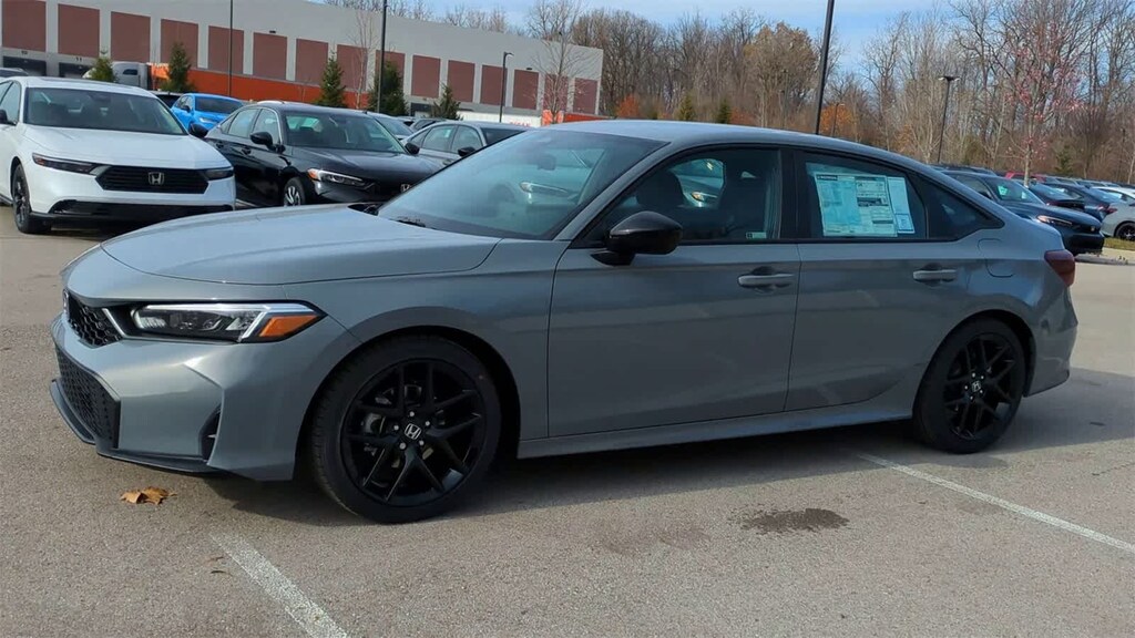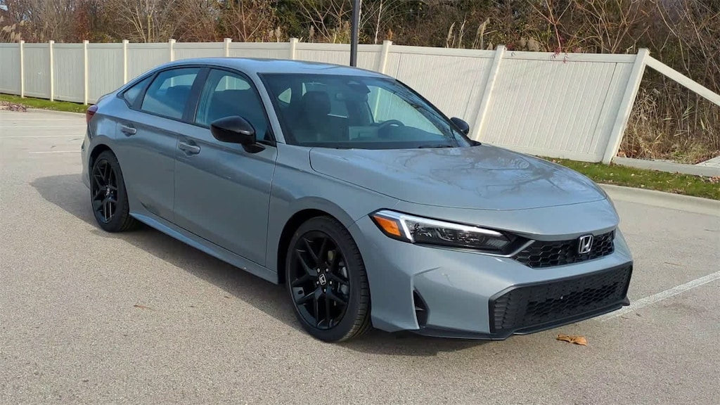 Black Artificial Leather, 4-Wheel Disc Brakes, 8 Speakers, ABS brakes, Adaptive Cruise Control: Adaptive Cruise Control (ACC) with Low-Speed Follow, Air Conditioning, Alloy wheels, AM/FM radio, Apple CarPlay/Android Auto, Auto High-beam Headlights, Automatic temperature control, Blind Spot Information (BSI) System warning, Brake assist, Bumpers: body-color, Cloth/Leatherette Seating Surfaces, Delay-off headlights, Driver door bin, Driver vanity mirror, Dual front impact airbags, Dual front side impact airbags, Electronic Stability Control, Emergency communication system: HondaLink, Exterior Parking Camera Rear, Four wheel independent suspension, Front anti-roll bar, Front Bucket Seats, Front Center Armrest, Front reading lights, Fully automatic headlights, Heated door mirrors, Illuminated entry, Knee airbag, Leather Shift Knob, Leather steering wheel, Low tire pressure warning, Occupant sensing airbag, Outside temperature display, Overhead airbag, Panic alarm, Passenger door bin, Passenger vanity mirror, Power door mirrors, Power steering, Power windows, Radio data system, Radio: 180-Watt Audio System, Rear anti-roll bar, Rear seat center armrest, Rear side impact airbag, Rear window defroster, Remote keyless entry, Security system, Speed control, Speed-sensing steering, Split folding rear seat, Steering wheel mounted audio controls, Tachometer, Telescoping steering wheel, Tilt steering wheel, Traction control, Trip computer, and Wheels: 18 Gloss Black Alloy Bluetooth Backup Camera. Urban Gray Pearl 2026 Honda Civic Sport CVT Black Artificial Leather.