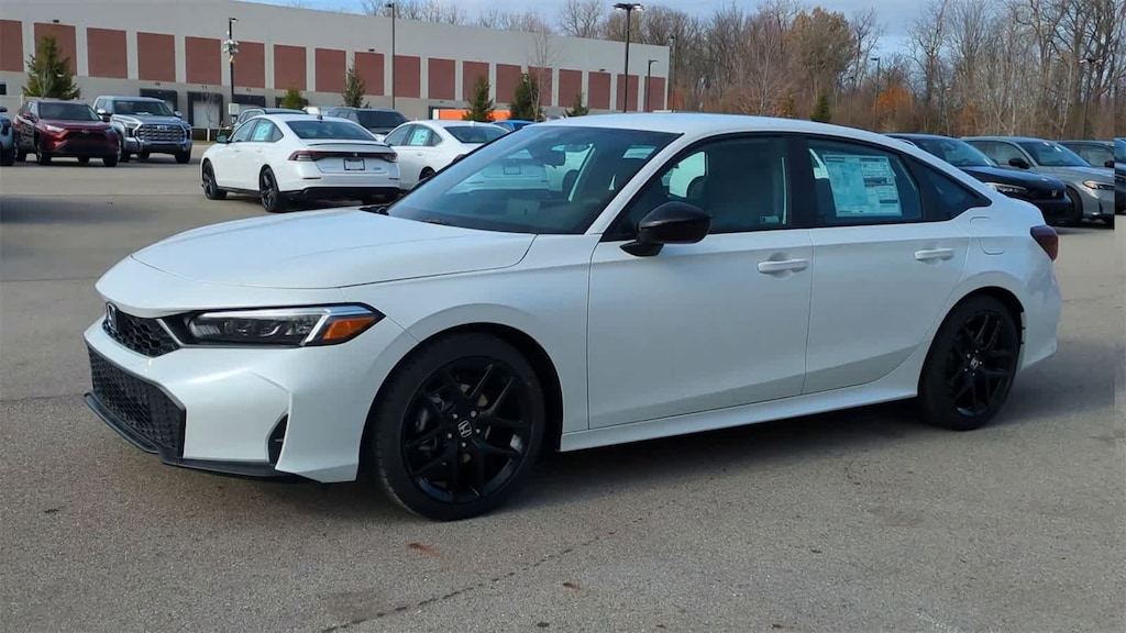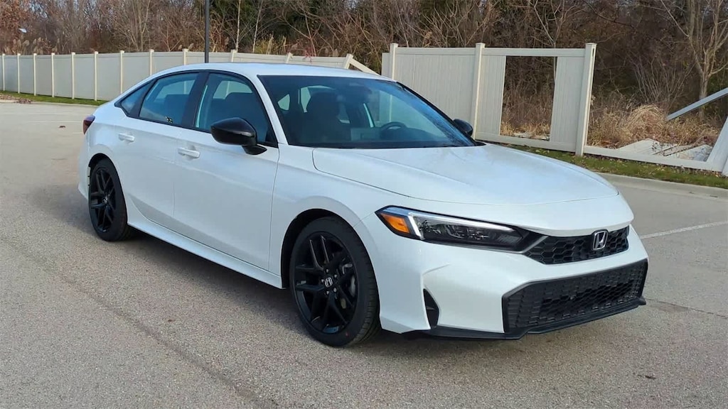 Black Artificial Leather, 4-Wheel Disc Brakes, 8 Speakers, ABS brakes, Adaptive Cruise Control: Adaptive Cruise Control (ACC) with Low-Speed Follow, Air Conditioning, Alloy wheels, AM/FM radio, Apple CarPlay/Android Auto, Auto High-beam Headlights, Automatic temperature control, Blind Spot Information (BSI) System warning, Brake assist, Bumpers: body-color, Cloth/Leatherette Seating Surfaces, Delay-off headlights, Driver door bin, Driver vanity mirror, Dual front impact airbags, Dual front side impact airbags, Electronic Stability Control, Emergency communication system: HondaLink, Exterior Parking Camera Rear, Four wheel independent suspension, Front anti-roll bar, Front Bucket Seats, Front Center Armrest, Front reading lights, Fully automatic headlights, Heated door mirrors, Illuminated entry, Knee airbag, Leather Shift Knob, Leather steering wheel, Low tire pressure warning, Occupant sensing airbag, Outside temperature display, Overhead airbag, Panic alarm, Passenger door bin, Passenger vanity mirror, Power door mirrors, Power steering, Power windows, Radio data system, Radio: 180-Watt Audio System, Rear anti-roll bar, Rear seat center armrest, Rear side impact airbag, Rear window defroster, Remote keyless entry, Security system, Speed control, Speed-sensing steering, Split folding rear seat, Steering wheel mounted audio controls, Tachometer, Telescoping steering wheel, Tilt steering wheel, Traction control, Trip computer, and Wheels: 18 Gloss Black Alloy Bluetooth Backup Camera. Platinum White Pearl 2026 Honda Civic Sport CVT Black Artificial Leather.