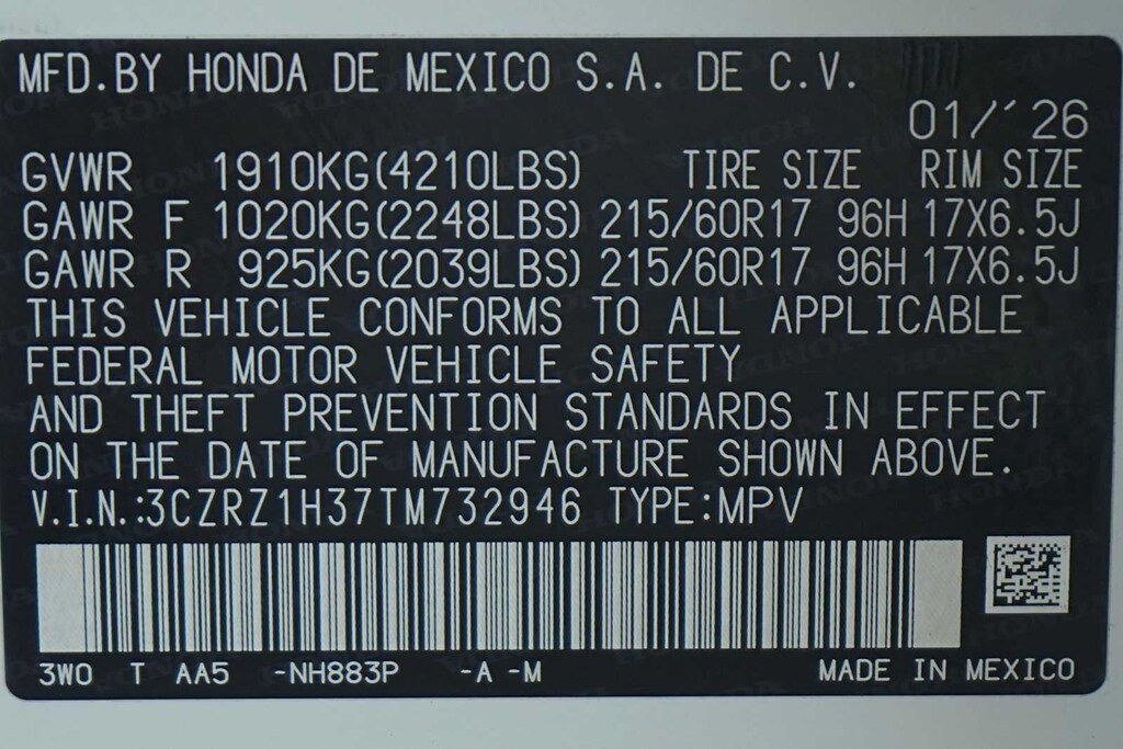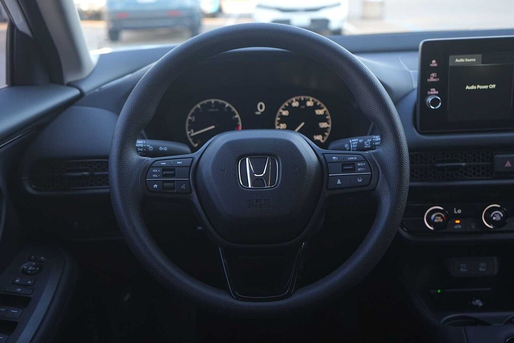 2026 Honda HR-V LX 4 Speakers, 4-Wheel Disc Brakes, ABS brakes, Adaptive Cruise Control: Adaptive Cruise Control (ACC) with Low-Speed Follow, Air Conditioning, Alloy wheels, AM/FM radio, Apple CarPlay/Android Auto, Auto High-beam Headlights, Automatic temperature control, Brake assist, Bumpers: body-color, Cloth Seat Trim, Compass, Delay-off headlights, Driver door bin, Driver vanity mirror, Dual front impact airbags, Dual front side impact airbags, Electronic Stability Control, Exterior Parking Camera Rear, Four wheel independent suspension, Front anti-roll bar, Front Bucket Seats, Front Center Armrest, Front reading lights, Fully automatic headlights, Illuminated entry, Knee airbag, Low tire pressure warning, Occupant sensing airbag, Outside temperature display, Overhead airbag, Panic alarm, Passenger door bin, Passenger vanity mirror, Power door mirrors, Power steering, Power windows, Radio data system, Radio: 180-Watt Audio System with 4 Speakers, Rear anti-roll bar, Rear reading lights, Rear side impact airbag, Rear window defroster, Rear window wiper, Remote keyless entry, Security system, Speed control, Speed-sensing steering, Split folding rear seat, Spoiler, Steering wheel mounted audio controls, Tachometer, Telescoping steering wheel, Tilt steering wheel, Traction control, Trip computer, Variably intermittent wipers, Wheels: 17 Pewter Gray Alloy. 26/32 City/Highway MPG
