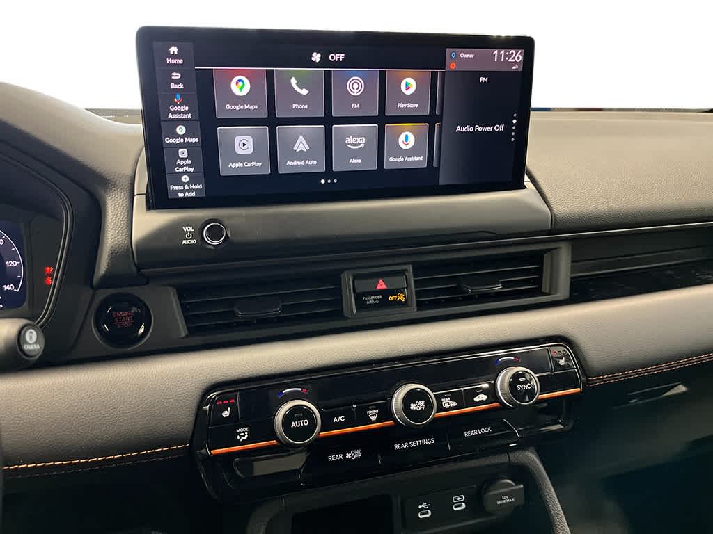 Third Row Seat, Navigation, Moonroof, Panoramic Roof, All Wheel Drive, Quad Bucket Seats, Power Liftgate, Rear Air, Heated Driver Seat, Heated Rear Seat, Back-Up Camera, iPod/MP3 Input, Onboard Communications System, Trailer Hitch, Aluminum Wheels. Rear Spoiler, MP3 Player, Keyless Entry, Privacy Glass, Remote Trunk Release. Honda TrailSport with Solar Silver Metallic exterior and Black w/ Orange Stitching interior features a V6 Cylinder Engine with 285 HP at 6100 RPM*.