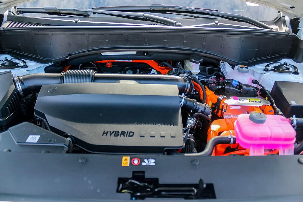 2.5L Turbocharged GDI 4-Cylinder Hybrid, 14 Speakers, 3rd row seats: split-bench, 4-Wheel Disc Brakes, ABS brakes, Air Conditioning, Alloy wheels, AM/FM radio: SiriusXM, Apple CarPlay & Android Auto, Audio memory, Auto High-beam Headlights, Auto-dimming door mirrors, Auto-dimming Rear-View mirror, Auto-leveling suspension, Automatic temperature control, Brake assist, Bumpers: body-color, Cargo Cover, Cargo Net, Cargo Tray, Carpeted Floor Mats, Compass, Delay-off headlights, Driver door bin, Driver vanity mirror, Dual front impact airbags, Dual front side impact airbags, Electronic Stability Control, Emergency communication system: None, Exterior Parking Camera Rear, Four wheel independent suspension, Front anti-roll bar, Front Bucket Seats, Front Center Armrest, Front dual zone A/C, Front reading lights, Fully automatic headlights, Garage door transmitter: HomeLink, Genuine wood console insert, Genuine wood dashboard insert, Heads-Up Display, Heated and Ventilated Front Bucket Seats, Heated door mirrors, Heated front seats, Heated rear seats, Heated steering wheel, HVAC memory, Illuminated entry, Knee airbag, Leather steering wheel, Low tire pressure warning, Memory seat, Navigation System, Occupant sensing airbag, Option Group 01, Outside temperature display, Overhead airbag, Overhead console, Panic alarm, Passenger door bin, Passenger vanity mirror, Power door mirrors, Power driver seat, Power Liftgate, Power moonroof, Power passenger seat, Power steering, Power windows, Premium Nappa Leather Seat Trim, Radio data system, Radio: Infotainment Navigation System, Rain sensing wipers, Rear air conditioning, Rear anti-roll bar, Rear audio controls, Rear reading lights, Rear side impact airbag, Rear window defroster, Rear window wiper, Reclining 3rd row seat, Remote keyless entry, Security system, Speed control, Split folding rear seat, Spoiler, Steering wheel mounted audio controls, Tachometer, Telescoping steering wheel, Tilt steering wheel, Traction control, Trip computer, Turn signal indicator mirrors, Variably intermittent wipers, Ventilated front seats, Ventilated rear seats, Wheels: 21 x 8.5J Alloy, 2.5L Turbocharged GDI 4-Cylinder Hybrid.