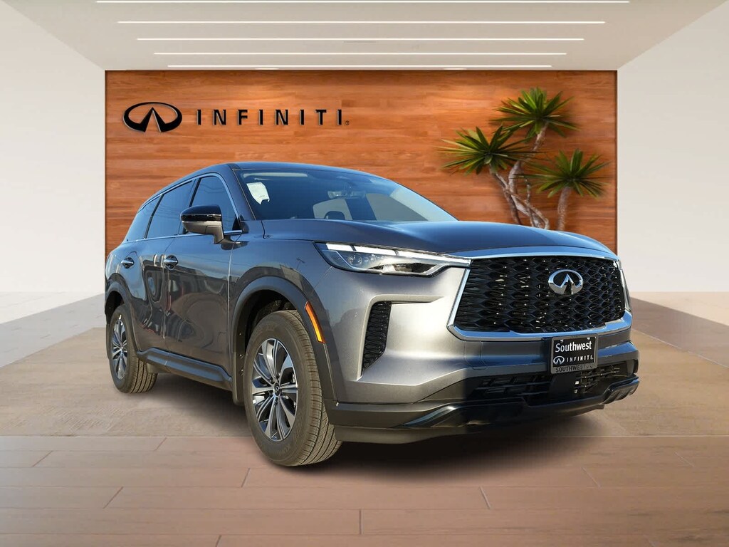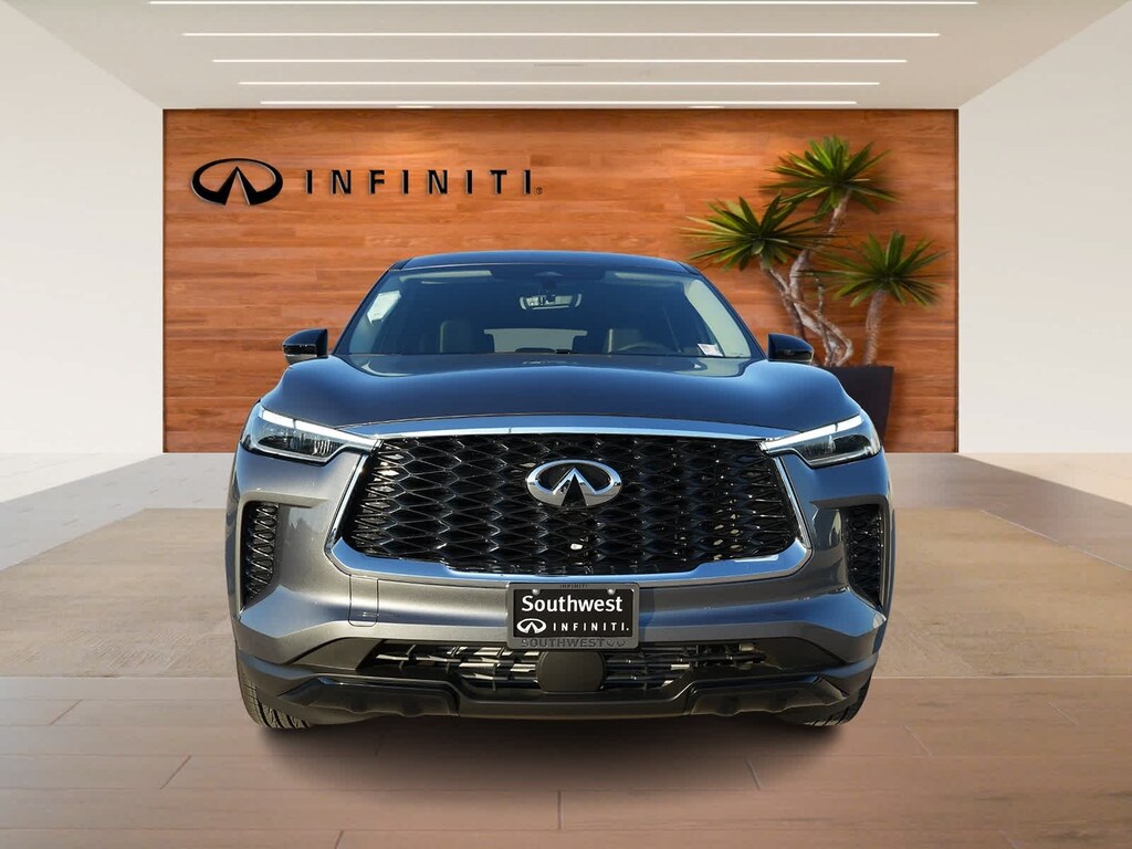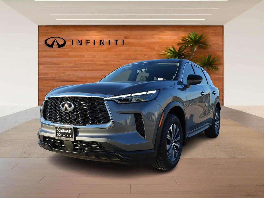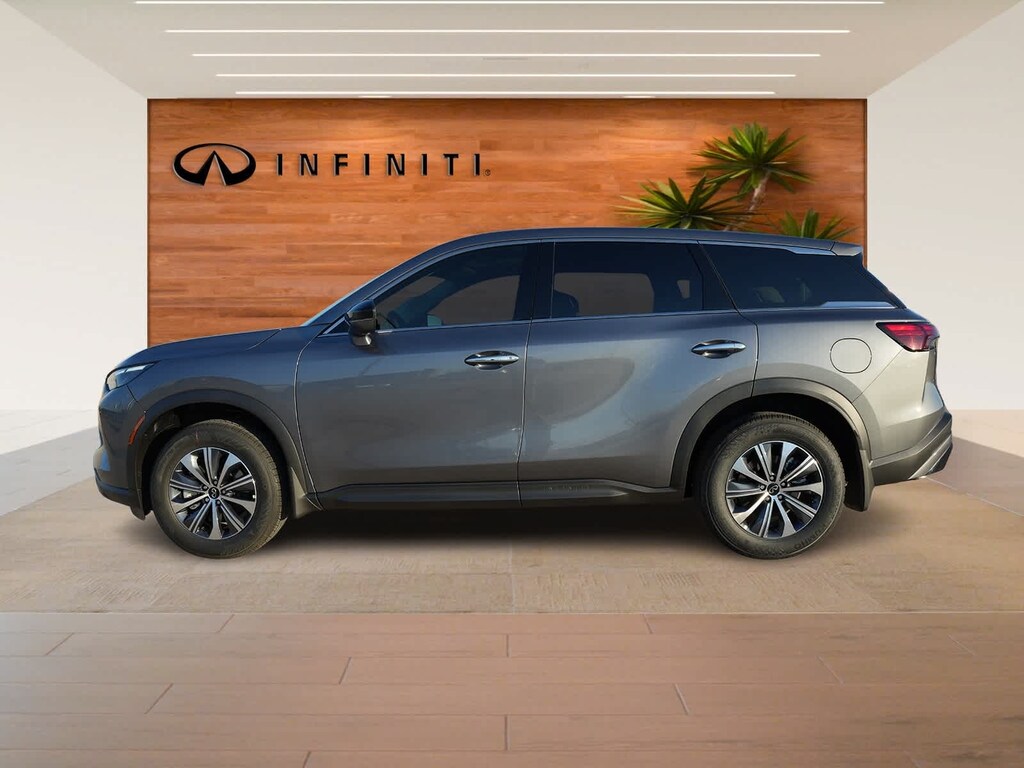 Graphite Shadow 2025 INFINITI QX60 PURE FWD 9-Speed Automatic 2.0L I4 Turbocharged DOHC 16V LEV3-ULEV50 268hp 3rd row seats: bench, 4-Wheel Disc Brakes, 9 Speakers, ABS brakes, Air Conditioning, Alloy wheels, AM/FM radio: SiriusXM, Anti-whiplash front head restraints, Apple CarPlay/Android Auto, Auto High-beam Headlights, Auto-dimming Rear-View mirror, Automatic temperature control, Blind Spot Warning, Brake assist, Bumpers: body-color, Cargo Mat (Reversible), Cargo Net, Cargo Package, Delay-off headlights, Driver door bin, Driver vanity mirror, Dual front impact airbags, Dual front side impact airbags, Electronic Stability Control, Emergency communication system: INFINITI InTouch, First Aid Kit, Floor Mats w/Bench Seats on 3rd Row Tray, Four wheel independent suspension, Front anti-roll bar, Front Bucket Seats, Front Center Armrest, Front dual zone A/C, Front reading lights, Fully automatic headlights, Heated door mirrors, Heated Front Bucket Seats, Heated front seats, Heated steering wheel, Illuminated entry, Knee airbag, Leather Shift Knob, Leather steering wheel, Leather-Appointed Seating Surfaces, Literature Kit, Low tire pressure warning, Memory seat, Occupant sensing airbag, Outside temperature display, Overhead airbag, Overhead console, Panic alarm, Passenger door bin, Passenger vanity mirror, Power door mirrors, Power driver seat, Power Liftgate, Power moonroof, Power passenger seat, Power steering, Power windows, Radio data system, Radio: AM/FM Audio System, Rain sensing wipers, Rear air conditioning, Rear anti-roll bar, Rear Parking Sensors, Rear reading lights, Rear seat center armrest, Rear side impact airbag, Rear window defroster, Rear window wiper, Reclining 3rd row seat, Remote keyless entry, Security system, Speed control, Speed-sensing steering, Speed-Sensitive Wipers, Splash Guards, Split folding rear seat, Spoiler, Steering wheel mounted audio controls, Tachometer, Telescoping steering wheel, Tilt steering wheel, Traction control, Trip computer, Turn signal indicator mirrors, Variably intermittent wipers, Wheels: 18 x 8J Machined Aluminum Alloy.