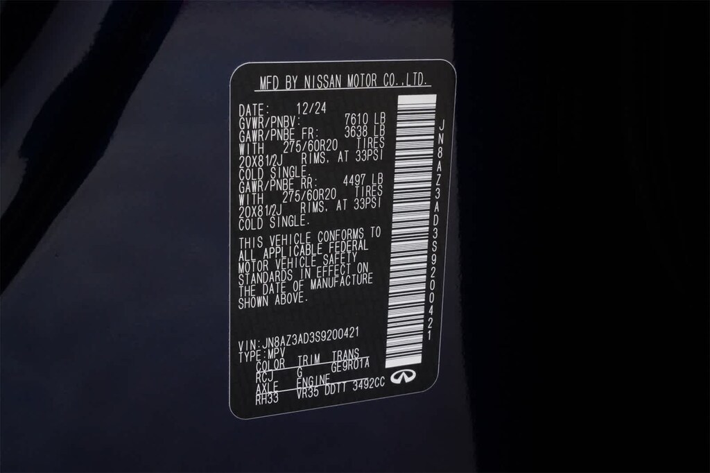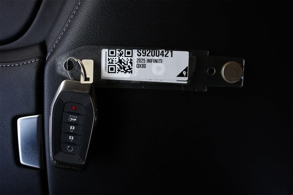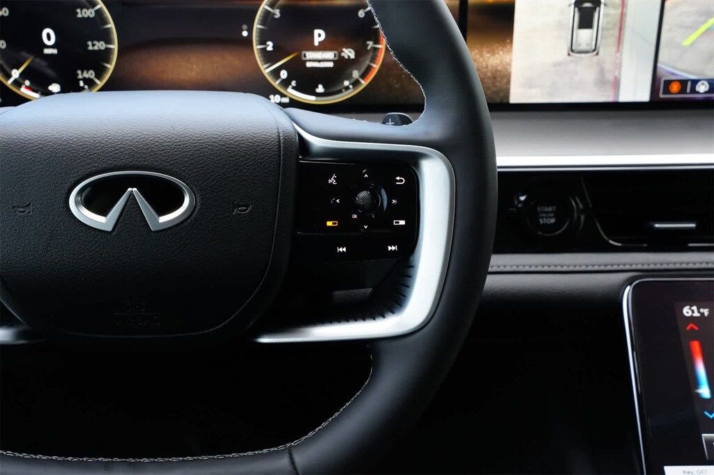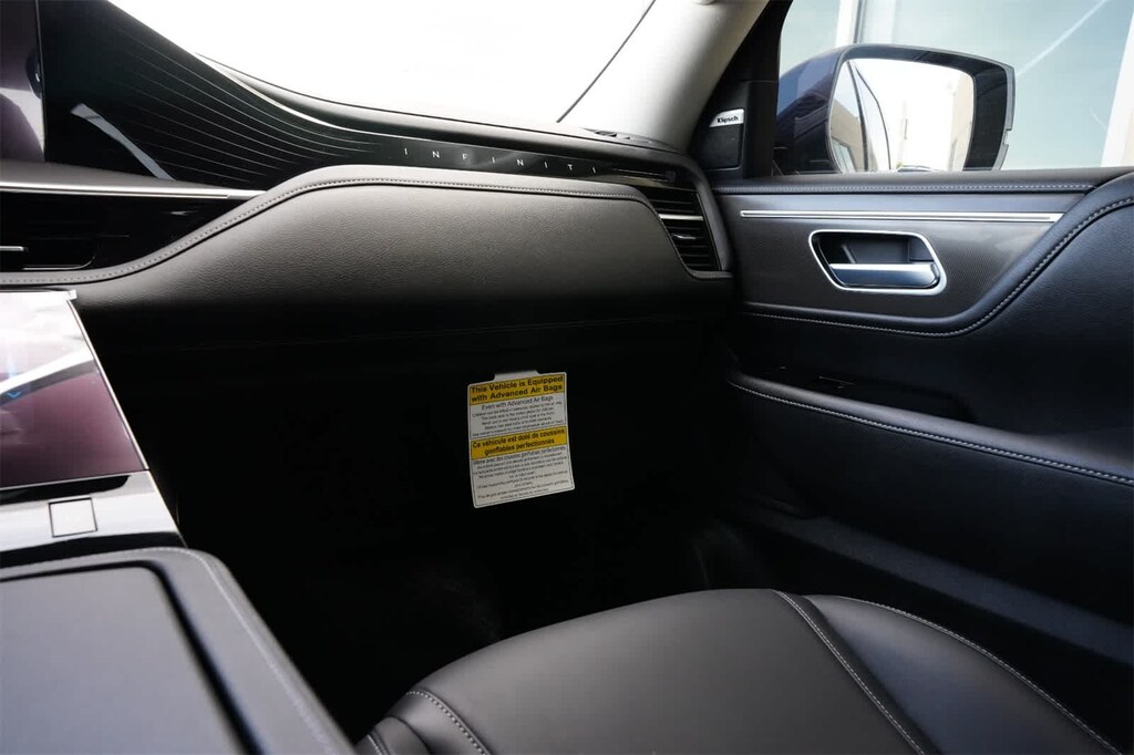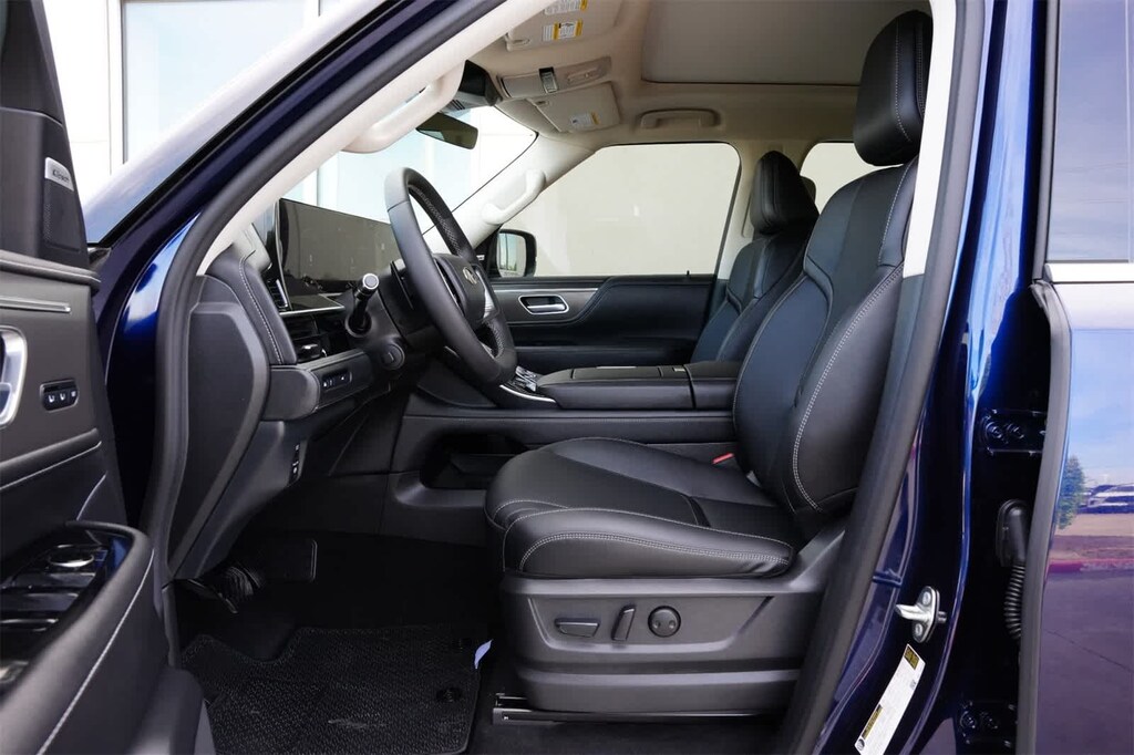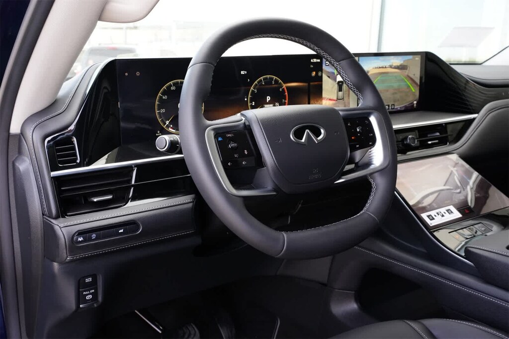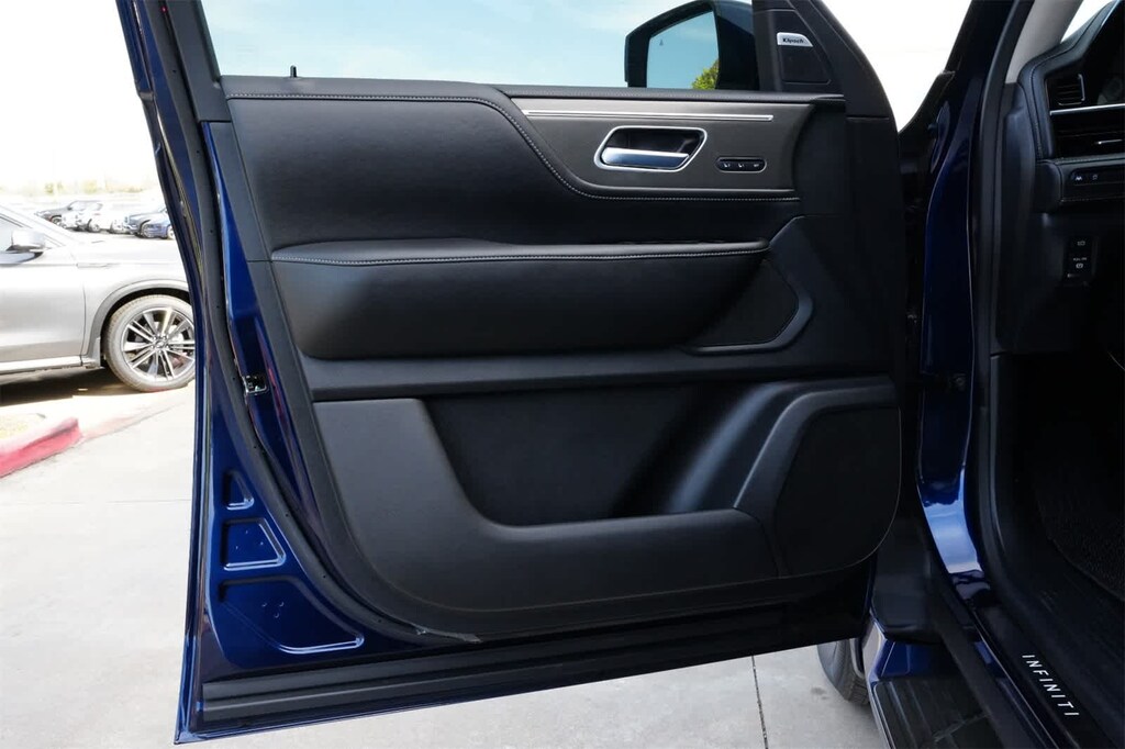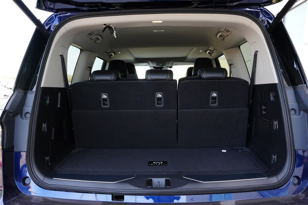 Grand Blue 2025 INFINITI QX80 PURE RWD 9-Speed Automatic 3.5L V6 DOHC 24V 14 Speakers, 20 x 8 Aluminum Alloy Wheels, 3rd row seats: bench, 4-Wheel Disc Brakes, ABS brakes, Air Conditioning, Alloy wheels, AM/FM radio: SiriusXM with 360L, Anti-whiplash front head restraints, Apple CarPlay/Android Auto, Audio memory, Auto High-beam Headlights, Auto tilt-away steering wheel, Auto-dimming door mirrors, Auto-dimming Rear-View mirror, Automatic temperature control, Brake assist, Bumpers: body-color, Cargo Blocks/Stabilizers, Cargo Net, Cargo Package, Carpeted Cargo Area Protector, Compass, Console Net, Delay-off headlights, Driver door bin, Driver vanity mirror, Dual front impact airbags, Dual front side impact airbags, Electronic Stability Control, Emergency communication system: INFINITI InTouch, Four wheel independent suspension, Front anti-roll bar, Front Bucket Seats, Front Center Armrest, Front dual zone A/C, Front reading lights, Fully automatic headlights, Garage door transmitter: myQ Connected Garage, Heated door mirrors, Heated Front Bucket Seats, Heated front seats, Heated rear seats, Heated steering wheel, HVAC memory, Illuminated entry, INFINITI Radiant Illuminated Kick Plates, Knee airbag, Leather steering wheel, Low tire pressure warning, Memory seat, Navigation system: Google Built-in, Occupant sensing airbag, Outside temperature display, Overhead airbag, Overhead console, Panic alarm, Passenger door bin, Passenger vanity mirror, Power door mirrors, Power driver seat, Power Liftgate, Power moonroof, Power passenger seat, Power steering, Power windows, Premium Paint, Radio data system, Radio: Klipsch Premium Audio System w/14 Speakers, Rain sensing wipers, Rear air conditioning, Rear anti-roll bar, Rear reading lights, Rear seat center armrest, Rear window defroster, Rear window wiper, Reclining 3rd row seat, Remote keyless entry, Security system, Soft-Sided Cargo Cooler, Speed control, Speed-sensing steering, Splash Guards, Split Bench Seat Package, Split folding rear seat, Spoiler, Steering wheel memory, Steering wheel mounted audio controls, Tachometer, TailorFit-Appointed Seating Surfaces, Telescoping steering wheel, Tilt steering wheel, Traction control, Trip computer, Turn signal indicator mirrors, Umbrella Holder, Variably intermittent wipers, CUSTOM 22 WHEELS.