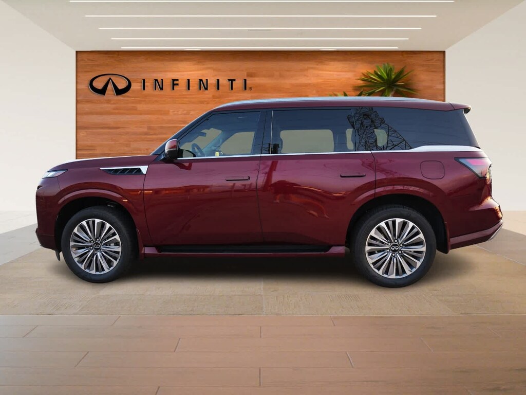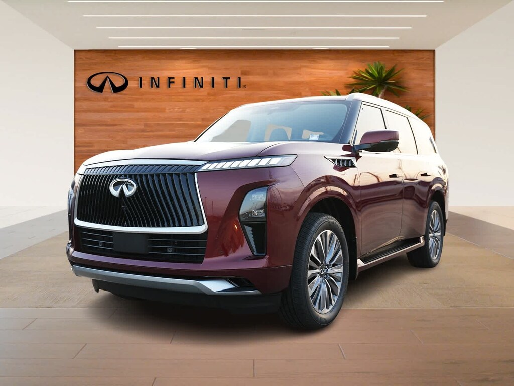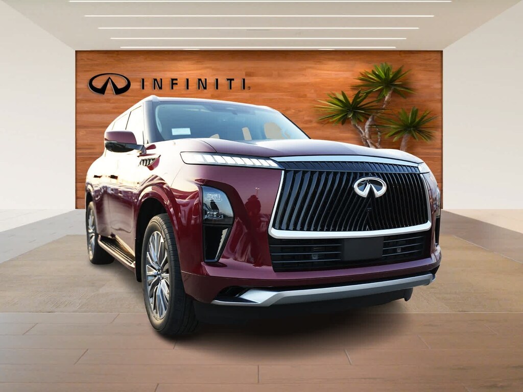 Coulis Red 2025 INFINITI QX80 LUXE 4WD 9-Speed Automatic 3.5L V6 DOHC 24V 14 Speakers, 3rd row seats: bench, 4-Wheel Disc Brakes, ABS brakes, Adaptive suspension, Air Conditioning, Alloy wheels, AM/FM radio: SiriusXM with 360L, Anti-whiplash front head restraints, Apple CarPlay/Android Auto, Audio memory, Auto High-beam Headlights, Auto tilt-away steering wheel, Auto-dimming door mirrors, Auto-dimming Rear-View mirror, Auto-leveling suspension, Automatic temperature control, Brake assist, Bumpers: body-color, Center Front Spoiler, Climate Controlled Front Bucket Seats, Compass, Delay-off headlights, Driver door bin, Driver vanity mirror, Dual front impact airbags, Dual front side impact airbags, Electronic Stability Control, Emergency communication system: INFINITI InTouch, Four wheel independent suspension, Front anti-roll bar, Front Bucket Seats, Front Center Armrest, Front dual zone A/C, Front reading lights, Fully automatic headlights, Garage door transmitter: myQ Connected Garage, Heads-Up Display, Heated door mirrors, Heated front seats, Heated rear seats, Heated steering wheel, HVAC memory, Illuminated entry, Knee airbag, Leather Seating Surfaces, Leather steering wheel, Literature Kit, Low tire pressure warning, Memory seat, Navigation system: Google Built-in, Occupant sensing airbag, Outside temperature display, Overhead airbag, Overhead console, Panic alarm, Passenger door bin, Passenger vanity mirror, Power door mirrors, Power driver seat, Power Liftgate, Power moonroof, Power passenger seat, Power steering, Power windows, Premium Paint, Radiant Front & Rear Doors Illuminated Kick Plates, Radio data system, Radio: Klipsch Premium Audio System w/14 Speakers, Rain sensing wipers, Rear air conditioning, Rear anti-roll bar, Rear reading lights, Rear seat center armrest, Rear window defroster, Rear window wiper, Reclining 3rd row seat, Remote keyless entry, Security system, Speed control, Speed-sensing steering, Split folding rear seat, Spoiler, Steering wheel memory, Steering wheel mounted audio controls, Tachometer, Telescoping steering wheel, Tilt steering wheel, Traction control, Trip computer, Turn signal indicator mirrors, Variably intermittent wipers, Ventilated front seats, Ventilated rear seats, Wheels: 22 x 8 Cast Aluminum Alloy.
