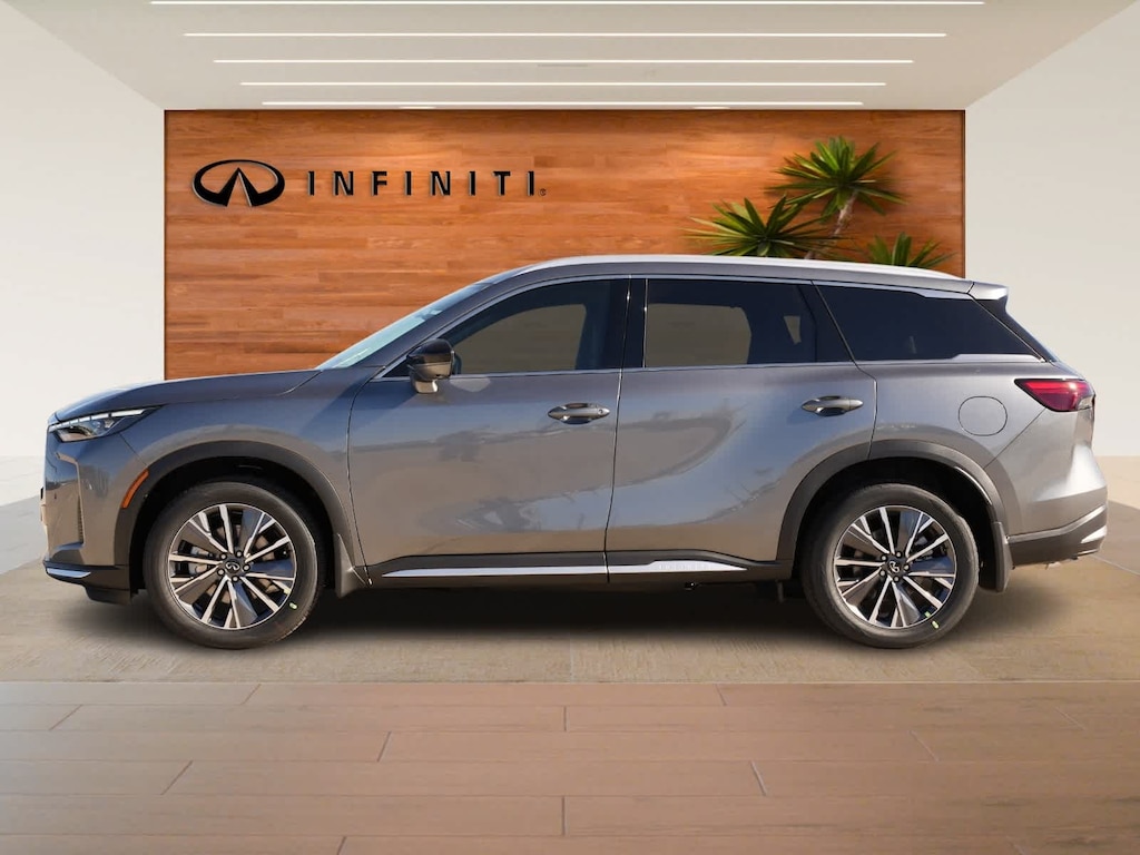 Graphite Shadow 2026 INFINITI QX60 LUXE AWD 9-Speed Automatic 2.0L I4 PDI Turbocharged DOHC 16V 268hp 17 Speakers, 3rd row seats: bench, 4-Wheel Disc Brakes, ABS brakes, Air Conditioning, Alloy wheels, AM/FM radio: SiriusXM with 360L, Anti-whiplash front head restraints, Apple CarPlay/Android Auto, Auto High-beam Headlights, Auto tilt-away steering wheel, Auto-dimming door mirrors, Auto-dimming Rear-View mirror, Automatic temperature control, Bose Performance Series 17-Speaker Sound System, Brake assist, Bumpers: body-color, Cargo Net, Cargo Package, Clear Rear Bumper Film, Climate Controlled Front Bucket Seats, Delay-off headlights, Driver door bin, Driver vanity mirror, Dual front impact airbags, Dual front side impact airbags, Electronic Stability Control, Emergency communication system: INFINITI InTouch, Four wheel independent suspension, Front anti-roll bar, Front Bucket Seats, Front Center Armrest, Front dual zone A/C, Front reading lights, Fully automatic headlights, Garage door transmitter: HomeLink, Heated door mirrors, Heated front seats, Heated rear seats, Heated steering wheel, Illuminated entry, Knee airbag, Leather Shift Knob, Leather steering wheel, Low tire pressure warning, Medic Kit, Memory seat, Navigation system: Google Built-in, Occupant sensing airbag, Outside temperature display, Overhead airbag, Overhead console, Panic alarm, Passenger door bin, Passenger vanity mirror, Power door mirrors, Power driver seat, Power Liftgate, Power moonroof: Panoramic, Power passenger seat, Power steering, Power windows, Radio data system, Radio: Klipsch Premium Audio System, Rain sensing wipers, Rear air conditioning, Rear anti-roll bar, Rear reading lights, Rear seat center armrest, Rear side impact airbag, Rear window defroster, Rear window wiper, Reclining 3rd row seat, Remote keyless entry, Security system, Speed control, Speed-sensing steering, Speed-Sensitive Wipers, Splash Guards, Split folding rear seat, Spoiler, Steering wheel memory, Steering wheel mounted audio controls, Tachometer, Tailorfit-Appointed Seating Surfaces, Telescoping steering wheel, Tilt steering wheel, Traction control, Trip computer, Turn signal indicator mirrors, Variably intermittent wipers, Ventilated front seats, Wheels: 20 x 8J Machined Aluminum Alloy.