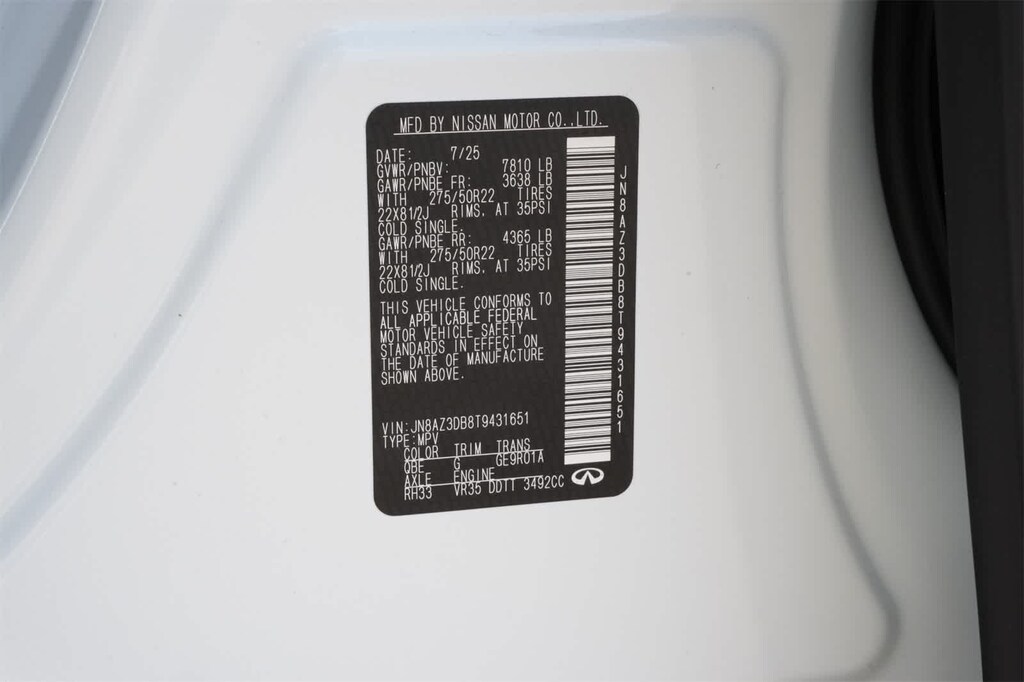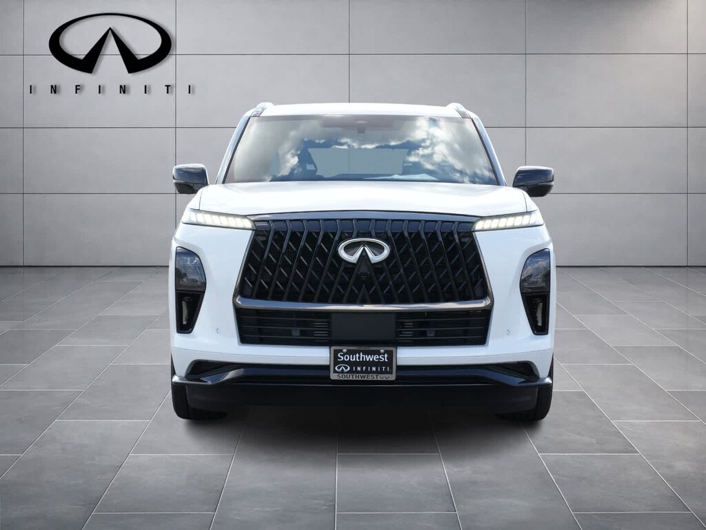 Radiant White 2026 INFINITI QX80 SPORT 4WD 9-Speed Automatic 3.5L V6 DOHC 24V 3rd row seats: bench, 4-Wheel Disc Brakes, ABS brakes, Adaptive suspension, Air Conditioning, Alloy wheels, AM/FM radio: SiriusXM with 360L, Anti-whiplash front head restraints, Apple CarPlay/Android Auto, Audio memory, Auto High-beam Headlights, Auto tilt-away steering wheel, Auto-dimming door mirrors, Auto-dimming Rear-View mirror, Auto-leveling suspension, Automatic temperature control, Brake assist, Compass, Delay-off headlights, Driver door bin, Driver vanity mirror, Dual front impact airbags, Dual front side impact airbags, Electronic Stability Control, Emergency communication system: INFINITI InTouch, Four wheel independent suspension, Front anti-roll bar, Front Bucket Seats, Front Center Armrest, Front dual zone A/C, Front reading lights, Fully automatic headlights, Garage door transmitter: HomeLink, Genuine wood dashboard insert, Genuine wood door panel insert, Heads-Up Display, Heated and Climate Controlled Front Bucket Seats with Massage, Heated door mirrors, Heated front seats, Heated rear seats, Heated steering wheel, HVAC memory, Illuminated entry, Knee airbag, Leather steering wheel, Low tire pressure warning, Memory seat, Navigation system: Google Built-in, Occupant sensing airbag, Outside temperature display, Overhead airbag, Overhead console, Panic alarm, Passenger door bin, Passenger vanity mirror, Power door mirrors, Power driver seat, Power Liftgate, Power moonroof, Power passenger seat, Power steering, Power windows, Radio data system, Radio: Klipsch Premiere Audio System, Rain sensing wipers, Rear air conditioning, Rear anti-roll bar, Rear reading lights, Rear seat center armrest, Rear window defroster, Rear window wiper, Reclining 3rd row seat, Remote keyless entry, Security system, Speed control, Speed-sensing steering, Split folding rear seat, Spoiler, Steering wheel memory, Steering wheel mounted audio controls, Super Premium Paint, Tachometer, Telescoping steering wheel, Tilt steering wheel, Traction control, Trip computer, Turn signal indicator mirrors, Unique SPORT Semi-Aniline Leather Seating Surfaces, Variably intermittent wipers, Ventilated front seats, Ventilated rear seats, Wheels: 22 x 8.5J Unique SPORT Alloy.
