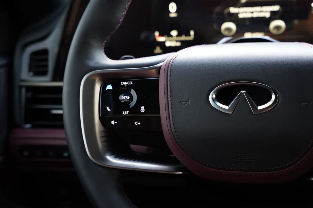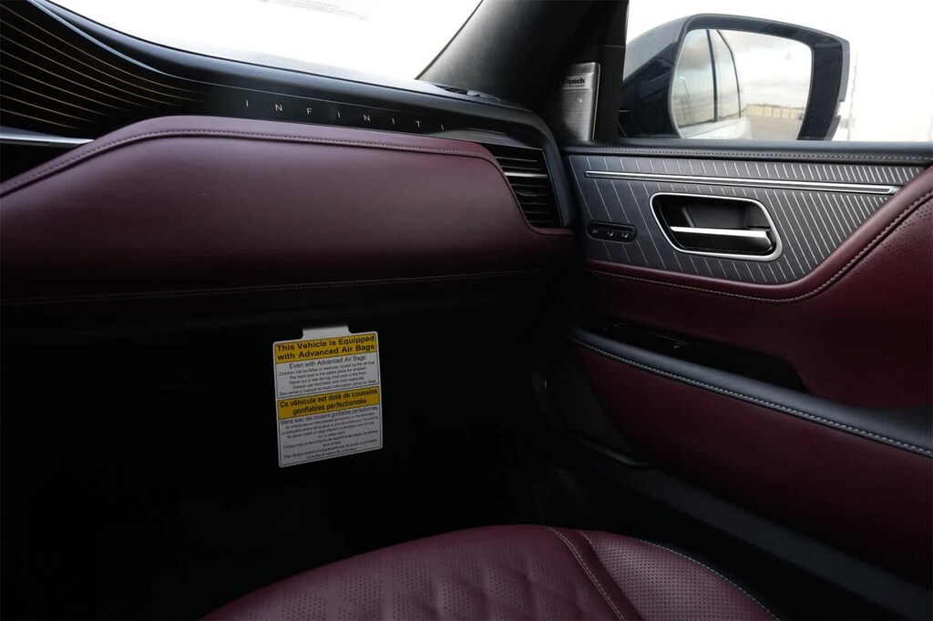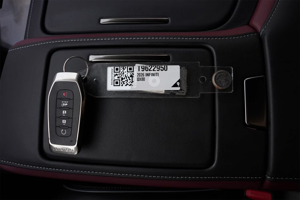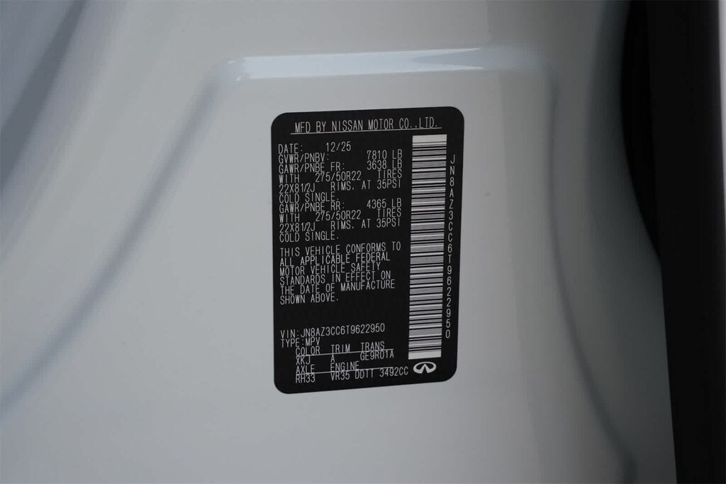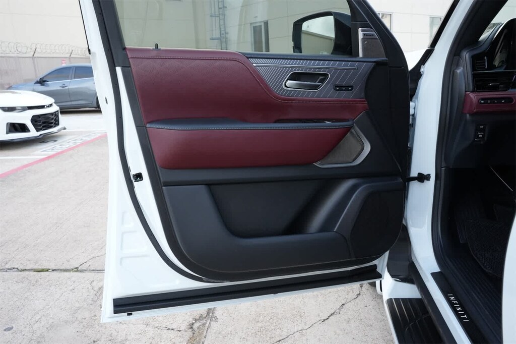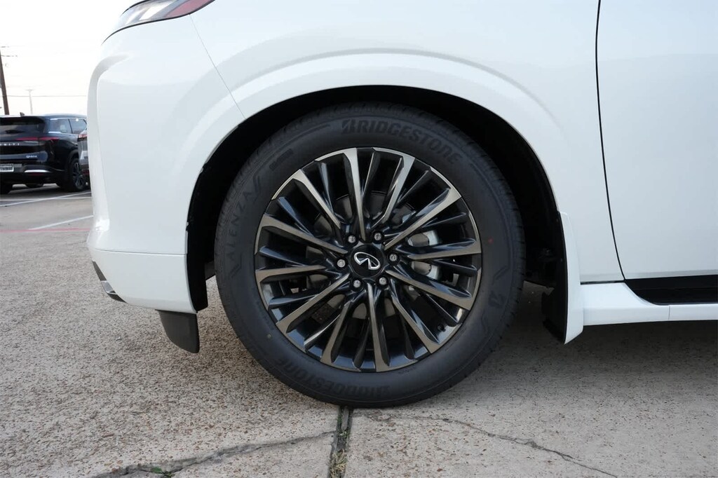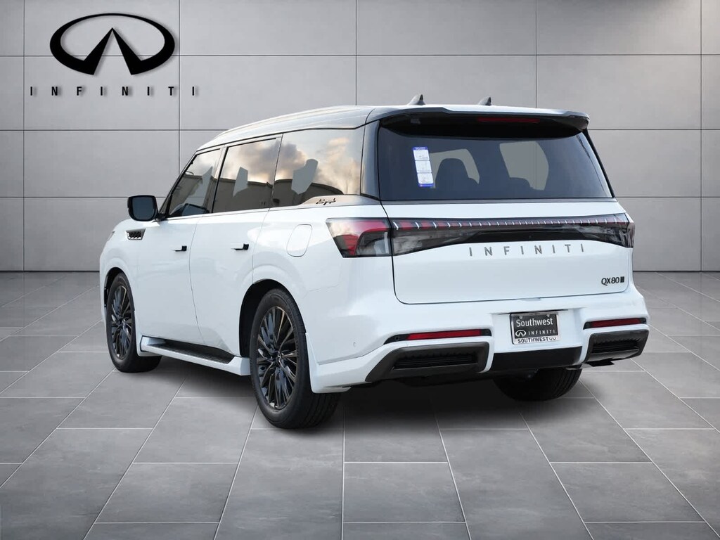 Radiant White/Black Obsidian 2026 INFINITI QX80 AUTOGRAPH 4WD 9-Speed Automatic 3.5L V6 DOHC 24V 3rd row seats: bench, 4-Wheel Disc Brakes, ABS brakes, Adaptive suspension, Air Conditioning, Alloy wheels, AM/FM radio: SiriusXM with 360L, Anti-whiplash front head restraints, Apple CarPlay/Android Auto, Audio memory, Auto High-beam Headlights, Auto tilt-away steering wheel, Auto-dimming door mirrors, Auto-dimming Rear-View mirror, Auto-leveling suspension, Automatic temperature control, Brake assist, Bumpers: body-color, Compass, Delay-off headlights, Driver door bin, Driver vanity mirror, Dual front impact airbags, Dual front side impact airbags, Electronic Stability Control, Emergency communication system: INFINITI InTouch, Four wheel independent suspension, Front anti-roll bar, Front Bucket Seats, Front Center Armrest, Front dual zone A/C, Front reading lights, Fully automatic headlights, Garage door transmitter: myQ Connected Garage, Genuine wood dashboard insert, Genuine wood door panel insert, Heads-Up Display, Heated and Climate Controlled Front Bucket Seats with Massage, Heated door mirrors, Heated front seats, Heated rear seats, Heated steering wheel, HVAC memory, Illuminated entry, Knee airbag, Leather steering wheel, Low tire pressure warning, Memory seat, Navigation system: Google Built-in, Occupant sensing airbag, Outside temperature display, Overhead airbag, Overhead console, Panic alarm, Passenger door bin, Passenger vanity mirror, Power door mirrors, Power driver seat, Power Liftgate, Power moonroof, Power passenger seat, Power steering, Power windows, Radio data system, Radio: Klipsch Premiere Audio System, Rain sensing wipers, Rear air conditioning, Rear anti-roll bar, Rear reading lights, Rear seat center armrest, Rear window defroster, Rear window wiper, Reclining 3rd row seat, Remote keyless entry, Security system, Semi-Aniline Premium Leather Seating Surfaces, Speed control, Speed-sensing steering, Split folding rear seat, Spoiler, Steering wheel memory, Steering wheel mounted audio controls, Tachometer, Telescoping steering wheel, Tilt steering wheel, Traction control, Trip computer, Turn signal indicator mirrors, Variably intermittent wipers, Ventilated front seats, Ventilated rear seats, Wheels: 22 x 8.5J Cast Aluminum-Alloy.