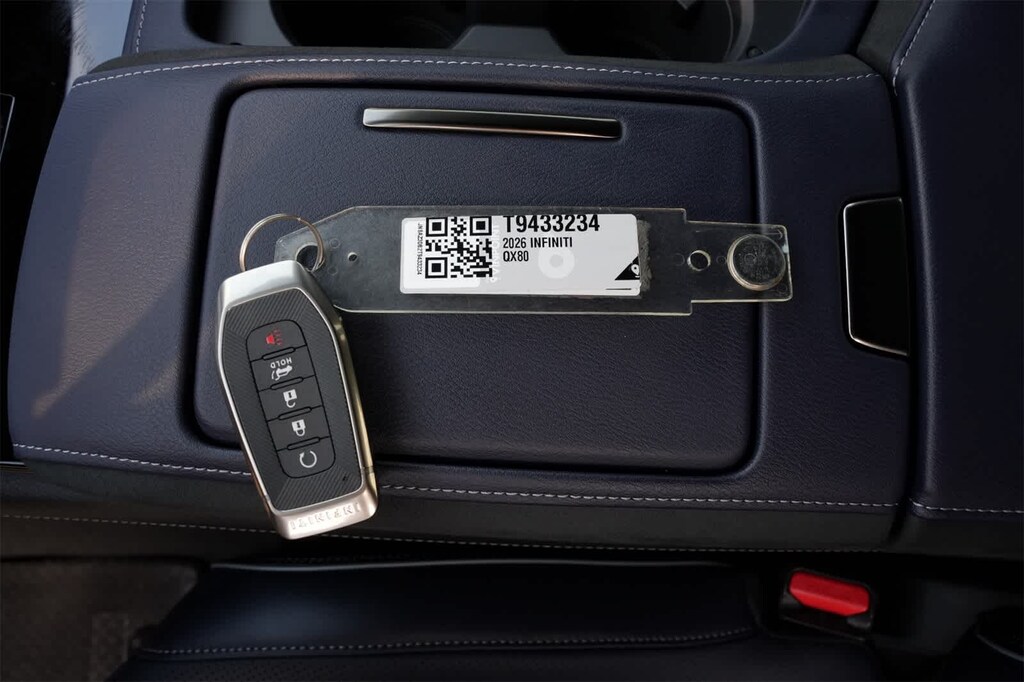 Dynamic Metal/Black Obsidian 2026 INFINITI QX80 SPORT 4WD 9-Speed Automatic 3.5L V6 DOHC 24V 3rd row seats: bench, 4-Wheel Disc Brakes, ABS brakes, Adaptive suspension, Air Conditioning, Alloy wheels, AM/FM radio: SiriusXM with 360L, Anti-whiplash front head restraints, Apple CarPlay/Android Auto, Audio memory, Auto High-beam Headlights, Auto tilt-away steering wheel, Auto-dimming door mirrors, Auto-dimming Rear-View mirror, Auto-leveling suspension, Automatic temperature control, Brake assist, Compass, Delay-off headlights, Driver door bin, Driver vanity mirror, Dual front impact airbags, Dual front side impact airbags, Electronic Stability Control, Emergency communication system: INFINITI InTouch, Four wheel independent suspension, Front anti-roll bar, Front Bucket Seats, Front Center Armrest, Front dual zone A/C, Front reading lights, Fully automatic headlights, Garage door transmitter: HomeLink, Genuine wood dashboard insert, Genuine wood door panel insert, Heads-Up Display, Heated and Climate Controlled Front Bucket Seats with Massage, Heated door mirrors, Heated front seats, Heated rear seats, Heated steering wheel, HVAC memory, Illuminated entry, Knee airbag, Leather steering wheel, Low tire pressure warning, Memory seat, Navigation system: Google Built-in, Occupant sensing airbag, Outside temperature display, Overhead airbag, Overhead console, Panic alarm, Passenger door bin, Passenger vanity mirror, Power door mirrors, Power driver seat, Power Liftgate, Power moonroof, Power passenger seat, Power steering, Power windows, Radio data system, Radio: Klipsch Premiere Audio System, Rain sensing wipers, Rear air conditioning, Rear anti-roll bar, Rear reading lights, Rear seat center armrest, Rear window defroster, Rear window wiper, Reclining 3rd row seat, Remote keyless entry, Security system, Speed control, Speed-sensing steering, Split folding rear seat, Spoiler, Steering wheel memory, Steering wheel mounted audio controls, Tachometer, Telescoping steering wheel, Tilt steering wheel, Traction control, Trip computer, Turn signal indicator mirrors, Unique SPORT Semi-Aniline Leather Seating Surfaces, Variably intermittent wipers, Ventilated front seats, Ventilated rear seats, Wheels: 22 x 8.5J Unique SPORT Alloy.