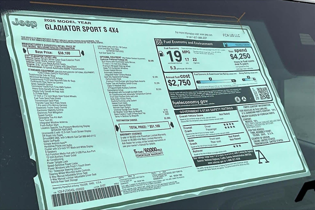 Lithia Chrysler Dodge Jeep Ram of Tri-Cities is pleased to offer this Bright White Clearcoat 2025 Jeep Gladiator Sport S for purchase, this vehicle is well equipped with many features including:Convenience Group (Corning Gorilla Glass, Daytime Running Lamp System, Emergency/Assistance Call, Front Door Locks 2-Door Passive Entry, Heated Front Seats, Heated Steering Wheel, Remote Start System, and Universal Garage Door Opener), Dark Sky Appearance Package (Body Color Fender Flares (2-Piece), Mold In Color Bumper w/Gloss Black, and Performance Hood), Quick Order Package 24S Sport S (Advanced Brake Assist, Automatic Headlamps, Deep Tint Sunscreen Windows, Enhanced Adaptive Cruise Control, Full Speed Forward Collision Warning Plus, Normal Duty Plus Suspension, Power Heated Mirrors, Premium Wrapped Steering Wheel, Security Alarm, Sun Visors w/Illuminated Vanity Mirrors, and Wheels: 17 x 7.5 Gray), Trailer Tow & Aux Switch Group (Auxiliary Switches, Class IV Receiver Hitch, Heavy-Duty Engine Cooling, and Trailer Hitch Zoom), 110 MPH Vehicle Max Speed Calibration, 12.3 Touchscreen Display, 3.73 Rear Axle Ratio, 4-Wheel Disc Brakes, 4G LTE Wi-Fi Hot Spot, 8 Speakers, ABS brakes, Air Conditioning, Alexa Built-In, AM/FM radio: SiriusXM, Apple CarPlay, Apple CarPlay/Android Auto, Black 3-Piece Hard Top, Brake assist, Cloth Low-Back Bucket Seats, Compass, Connectivity - US/Canada, Delay-off headlights, Driver door bin, Driver vanity mirror, Dual front impact airbags, Dual front side impact airbags, Electronic Stability Control, Freedom Panel Storage Bag, Front anti-roll bar, Front Bucket Seats, Front Center Armrest w/Storage, Front fog lights, Front License Plate Bracket, Front reading lights, Google Android Auto, Illuminated entry, Integrated roll-over protection, Low tire pressure warning, Manufacturers Statement of Origin, MOPAR All-Weather Slush Mats, MOPAR Spray In Bedliner, Normal Duty Suspension, Occupant sensing airbag, Outside temperature display, Overhead airbag, Panic alarm, ParkView Rear Back-Up Camera, Passenger door bin, Passenger vanity mirror, Power steering, Power windows, Radio data system, Radio: Uconnect 5 w/12.3 Display, Rear anti-roll bar, Rear reading lights, Rear Sliding Window, Rear Window Defroster, Remote keyless entry, Speed control, Split folding rear seat, Steering wheel mounted audio controls, Tachometer, Telescoping steering wheel, Tilt steering wheel, Traction control, Trip computer, USB Host Flip, Variably intermittent wipers, Voltmeter, and Wheels: 17 x 7.5 Black Steel Styled.