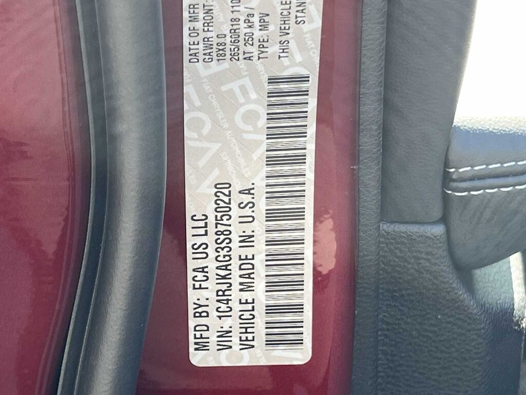 QUICK ORDER PACKAGE 23B ALTITUDE Engine: 3.6L V6 24V VVT UPG I w/ESS, Transmission: 8-Speed Automatic (8HP50), Selectable Tire Fill Alert, Remote Start System, Rain Sensitive Windshield Wipers, Wireless Charging Pad, Heated Front Seats, Altitude Appearance Package, Black Headliner, Delete Laredo Badge, 3rd Row Charge-Only USB Ports, 115V Auxiliary Power Outlet, Gloss Black Exterior Accents, Heated Steering Wheel, Power Liftgate, TRAILER TOW PACKAGE Rear Load Leveling Suspension, Full Size Spare Tire, 180 Amp Alternator, 7 & 4 Pin Wiring Harness, Dual Exhaust Tips, Heavy Duty Engine Cooling, 18 Full-Size Steel Spare Wheel, Automatic Headlamp Leveling System, Trailer Hitch Zoom, Class IV Receiver Hitch, TRANSMISSION: 8-SPEED AUTOMATIC (8HP50) (STD), ENGINE: 3.6L V6 24V VVT UPG I W/ESS (STD). Jeep Altitude with Velvet Red Pearlcoat exterior and Global Black interior features a V6 Cylinder Engine with 293 HP at 6400 RPM*.