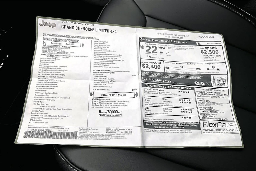 Lithia Chrysler Dodge Jeep Ram of Tri-Cities is pleased to offer this Bright White Clearcoat 2025 Jeep Grand Cherokee Limited for purchase, this vehicle is well equipped with many features including:Blackout Model (Black Painted Roof, Delete Limited Badge, Dual-Pane Panoramic Sunroof, Gloss Black Exterior Accents, and Wheels: 20 x 8.5 Black Painted Aluminum), Quick Order Package 22E, 4WD, 4-Wheel Disc Brakes, 6 Speakers, ABS brakes, Active Noise Control System, Air Conditioning, Alloy wheels, AM/FM radio: SiriusXM with 360L, Anti-whiplash front head restraints, Audio memory, Auto High-beam Headlights, Automatic temperature control, Brake assist, Bumpers: body-color, Capri Leatherette Seats, Compass, Delay-off headlights, Driver door bin, Driver vanity mirror, Dual front impact airbags, Dual front side impact airbags, Electronic Stability Control, Emergency communication system, Four wheel independent suspension, Front anti-roll bar, Front Bucket Seats, Front Center Armrest w/Storage, Front dual zone A/C, Front fog lights, Front License Plate Bracket, Front reading lights, Fully automatic headlights, Garage door transmitter, Heated door mirrors, Heated front seats, Heated rear seats, Heated steering wheel, Illuminated entry, Knee airbag, Low tire pressure warning, Memory seat, Model Year Tracking, Navigation System, Normal Duty Suspension, Occupant sensing airbag, Outside temperature display, Overhead airbag, Overhead console, Panic alarm, ParkView Rear Back-Up Camera, Passenger door bin, Passenger vanity mirror, Power door mirrors, Power driver seat, Power Liftgate, Power passenger seat, Power steering, Power windows, Radio data system, Radio: Uconnect 5 Nav with 10.1 Display, Rear anti-roll bar, Rear reading lights, Rear window defroster, Rear window wiper, Remote keyless entry, Security system, Speed control, Speed-Sensitive Wipers, Split folding rear seat, Spoiler, Steering wheel mounted audio controls, Tachometer, Telescoping steering wheel, Tilt steering wheel, Traction control, Trip computer, Turn signal indicator mirrors, Variably intermittent wipers, Voltmeter, and Wheels: 18 x 8 Polished/Painted Aluminum. Recent Arrival! 19/26 City/Highway MPG